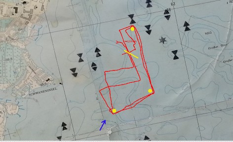 Am nächsten Tag sind wir nach 1h 15‘ Fahrt wieder vor Ort, bereiten Christl vor und dann ist Steuermannsbesprechung. Es weht mit 3 bis 4 Bft aus südlichen Richtungen, es wird ein Dreieck zwischen dem Verein und der Untiefe „der große Stein“ ausgebracht.