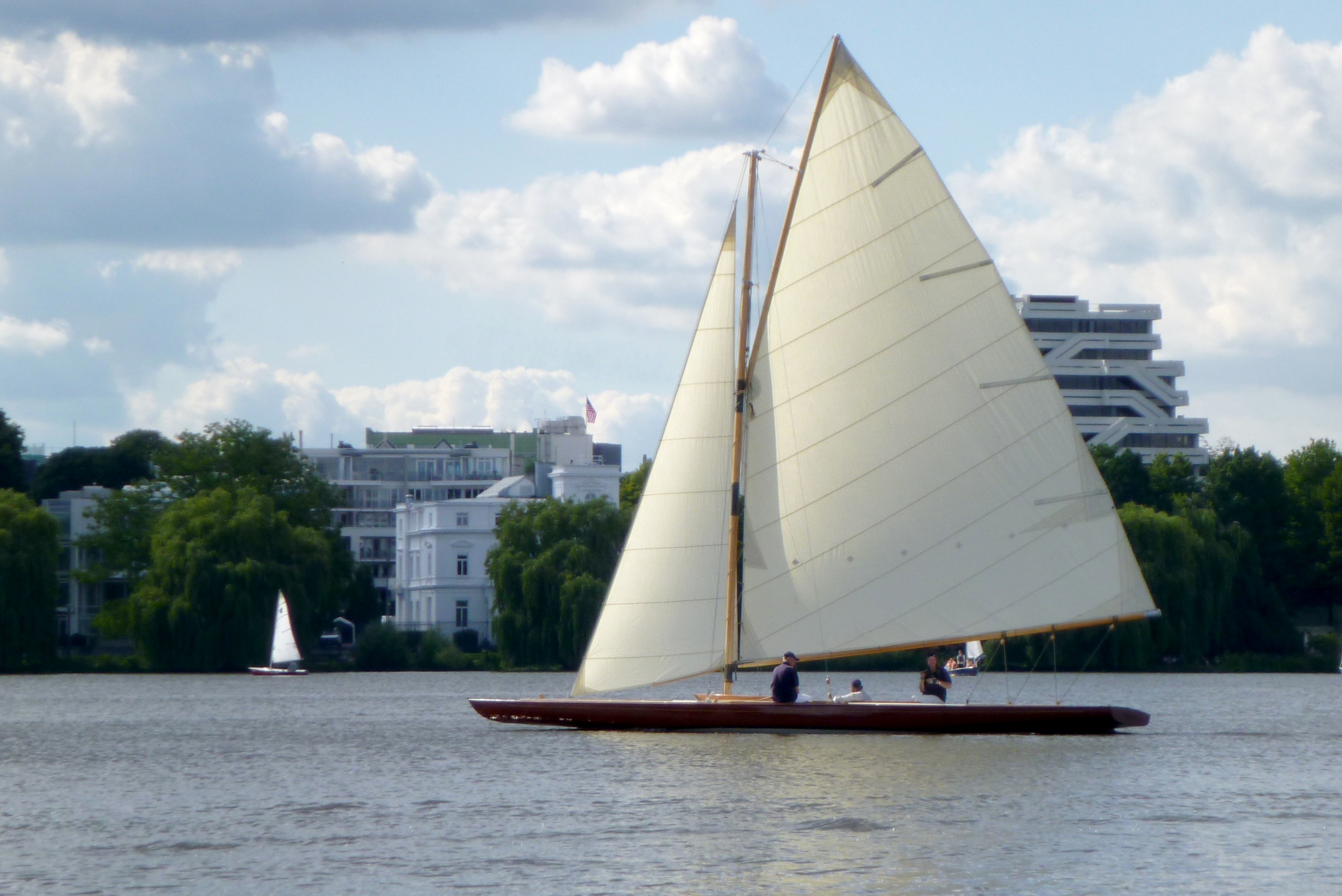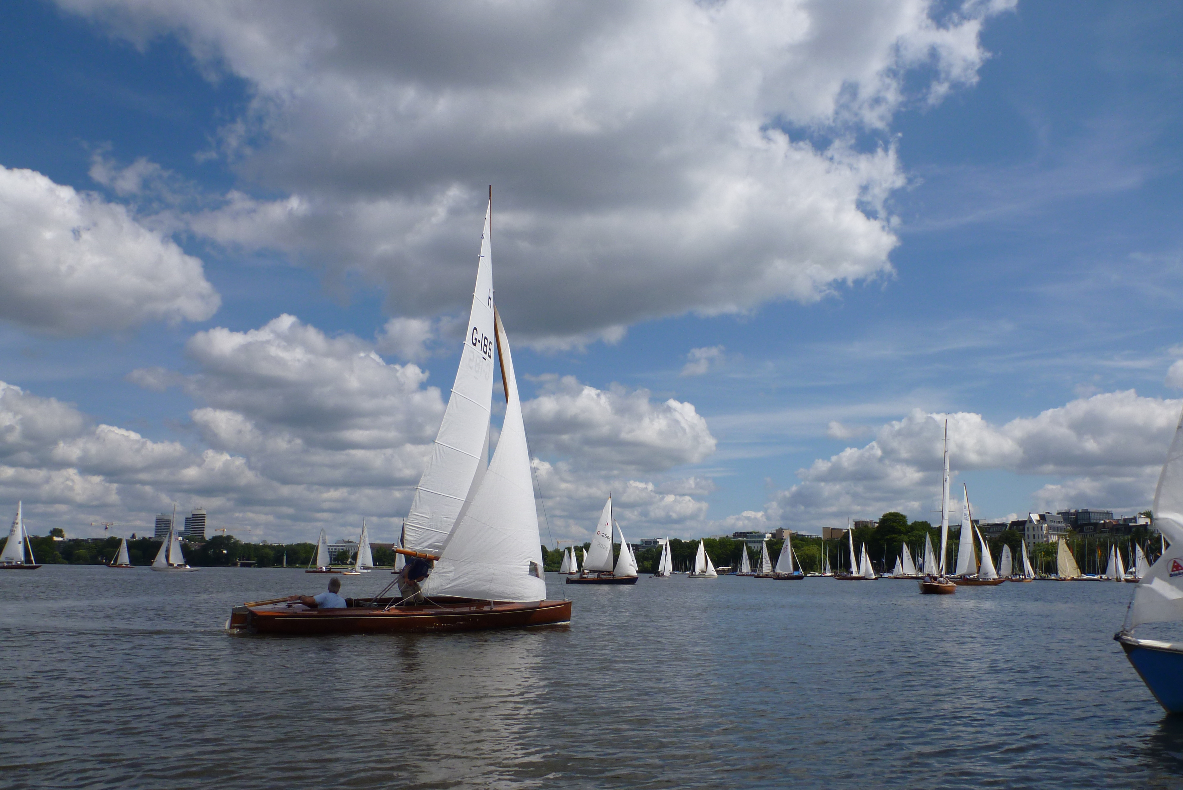 Das Wetter spielte mit. Nachdem am Freitag Nachmittag bei durchwachsenen Temperaturen noch Schauer über die Stege der Alsterinsel zogen überwog am Samstag die Sonne bei vorwiegend heiterem Himmel. Die erste Wettfahrt startete bei leichten östlichen Winden nach dem Känguruh system. Wir mußten dem ersten 11 Minuten und 45 Sekunden Vorsprung geben und starteten so als viertletzter. Nur die beiden FD's und die "Tilly XV" mußten noch später starten.Der Kurs war über die gesamte Alsterbreite als eine Kombination von zwei ineinander verschachtelten Dreiecken ausgelegt. Das machte es bei der insgesammt doch recht vollen Alster zeitweise schwierig auszumachen, wo man als nächstes hinsegeln sollte.