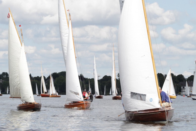 Inerhalb von zwei Stunden hatten wir das Boot im Wasser, zum Liegeplatz gepaddelt, den Mast gestellt und aufgeriggt. Dann sind wir wieder nach Hause und am nächsten Morgen rechtzeitig zur Steuermannsbesprechung zusammen mit Larissa wiedergekommen. Um 12 Uhr fiel der erste Startschuß: Die größte Gruppe der Starter stellten die H-Jollen (19 Meldungen) mit ihren Variationen Elb-H-Jolle und Berliner H-Jolle, gefolgt von den Drachen (10 Starter). Aber auch Hansa-Jollen, Folke-(junior)-Boote, Zugvögel (einschließlich des "Ur-Zugvolgels" G1), Flying dutchman, Korsare, M-,Z- & E-Jollen und viel andere mehr traten an, wir waren die einzige J-Jolle.