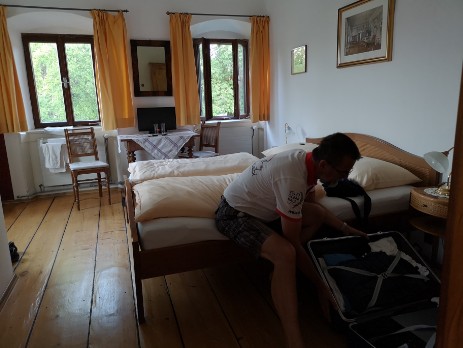 Der Gasthof ist ein Haus aus dem 17. Jahrhundert, leicht antiquarisch, moderat modernisiert. Das heißt dicke Wände, die die Zimmer schön kühl halten. Wir haben zwei schöne Zimmer nach vorne mit Blick auf den See, aber auch die stark befahrenen Straße.