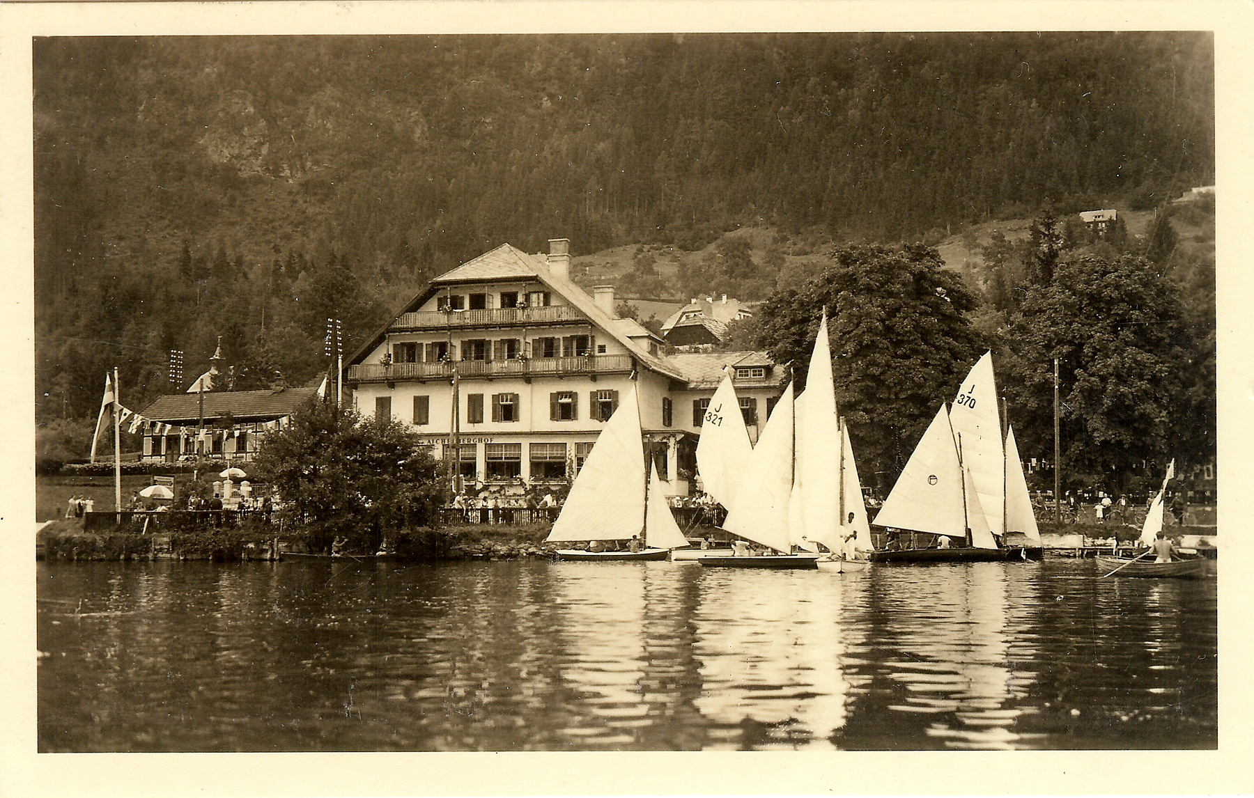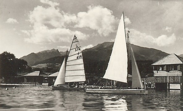 J 321 "Ghilbella" des Veldener SV und die J 370 "Husch Husch" des Union YC Wörthersee auf dem Ossiacher See vor dem Hotel Aichelberghof in Annenheim. Beide Boote wurden 1925 erstmalig registriert.