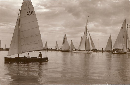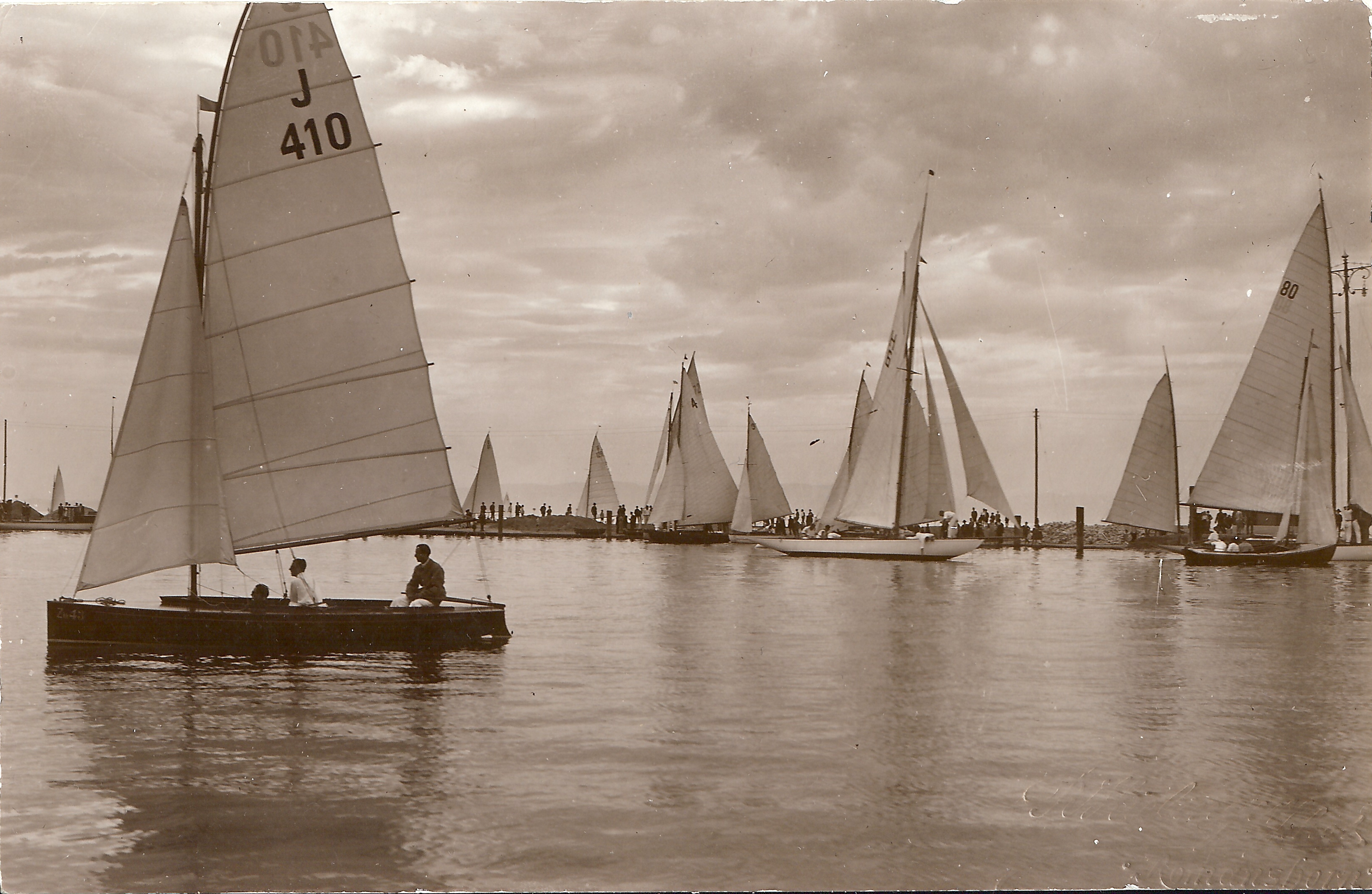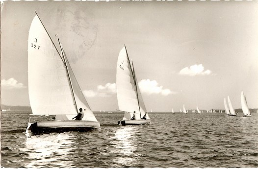 J 327 "Sassa III" und J 416 "Kiebitz XV" im Vordergrund (die Segelnummern der voraus laufenden Boote sind auch im Orginal nicht zu erkennen).