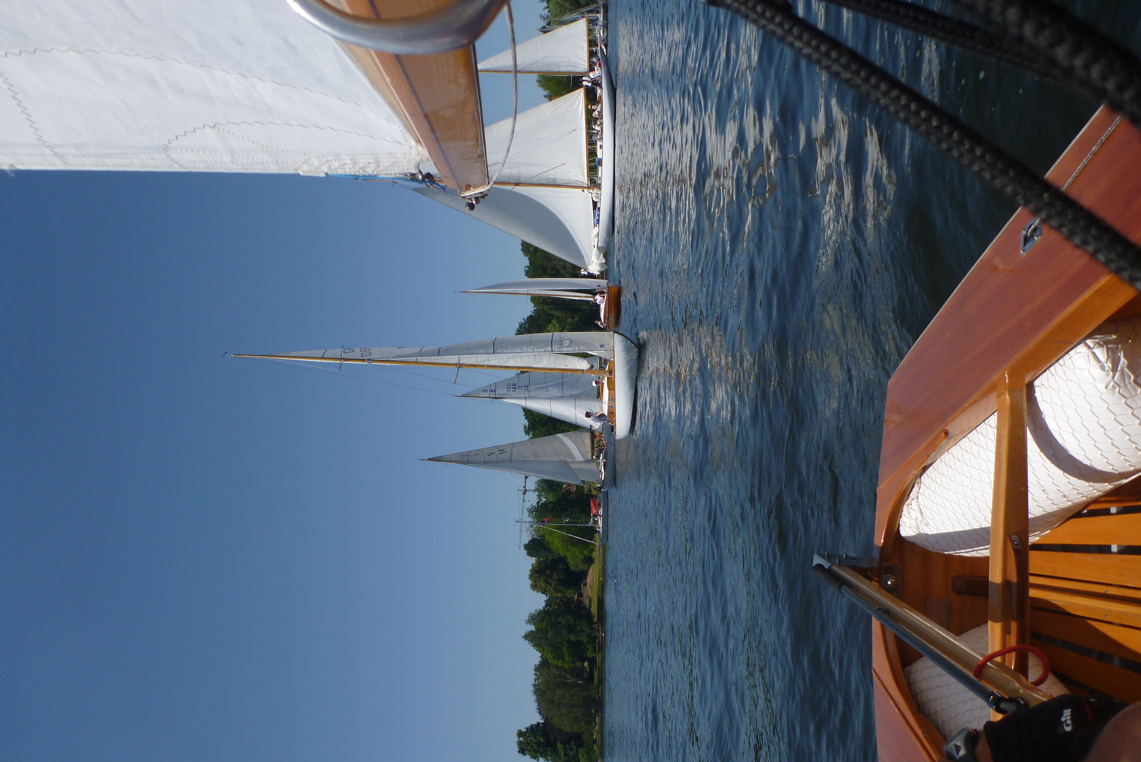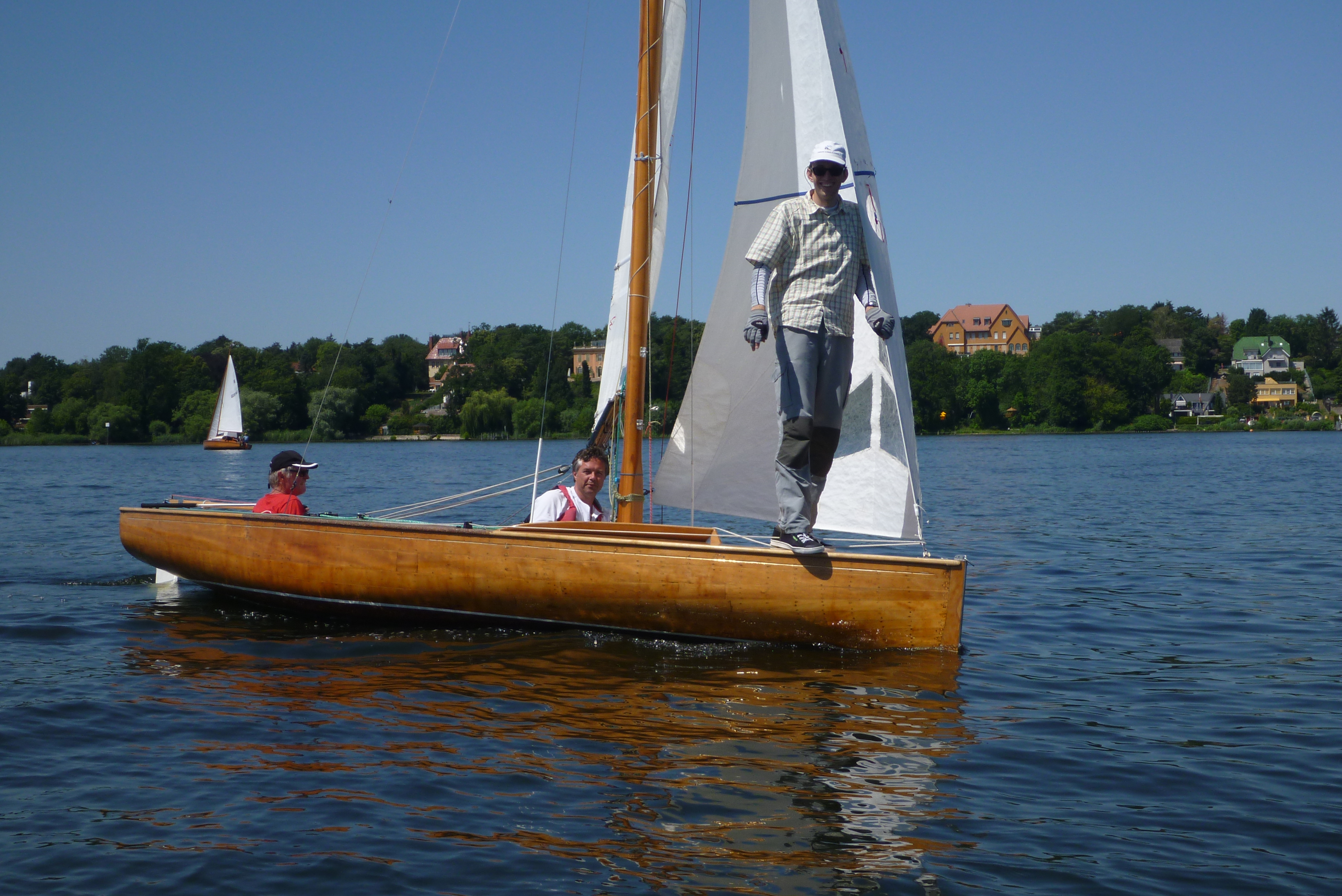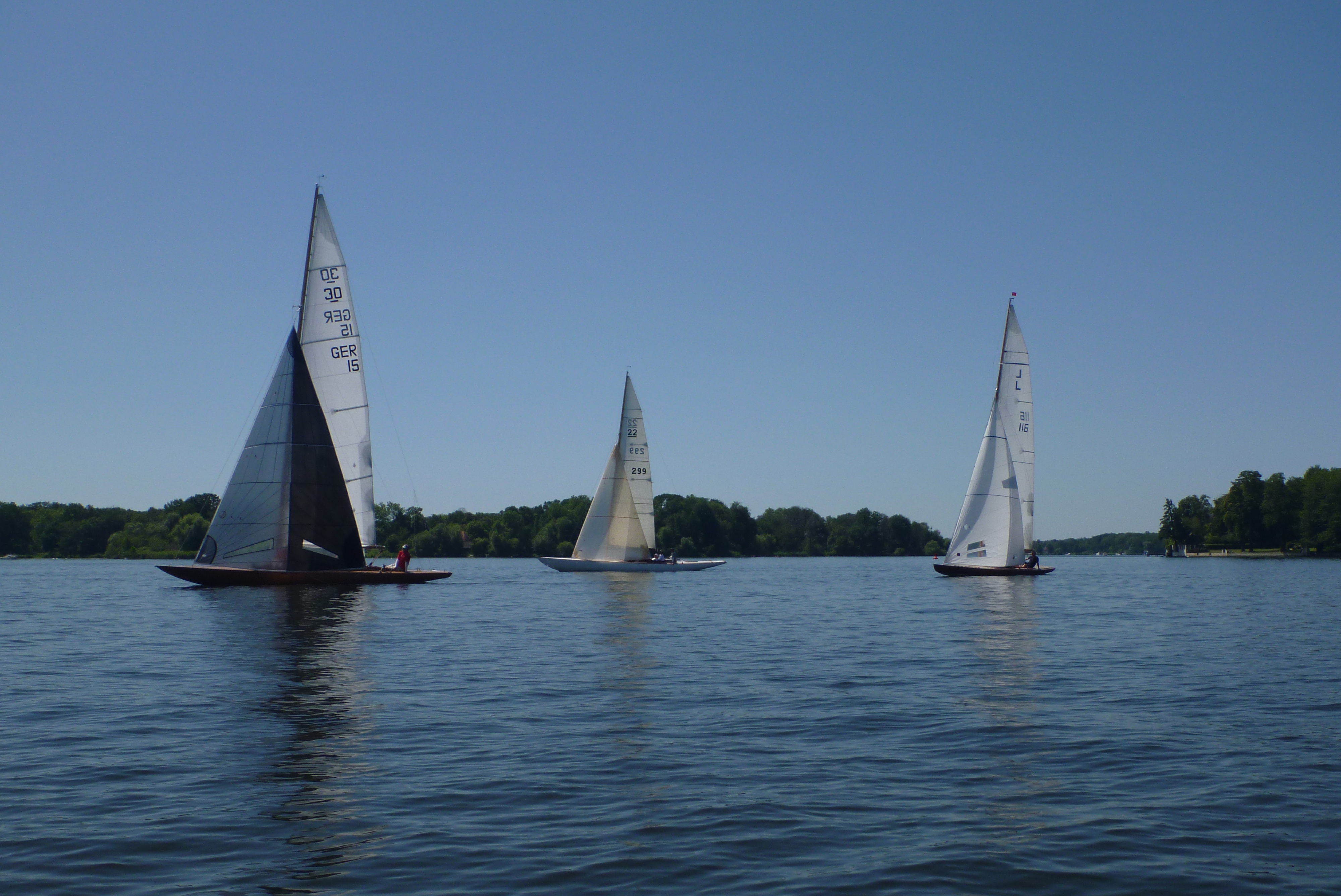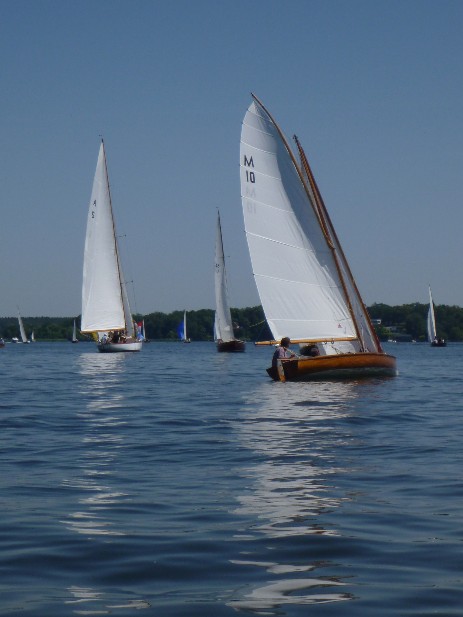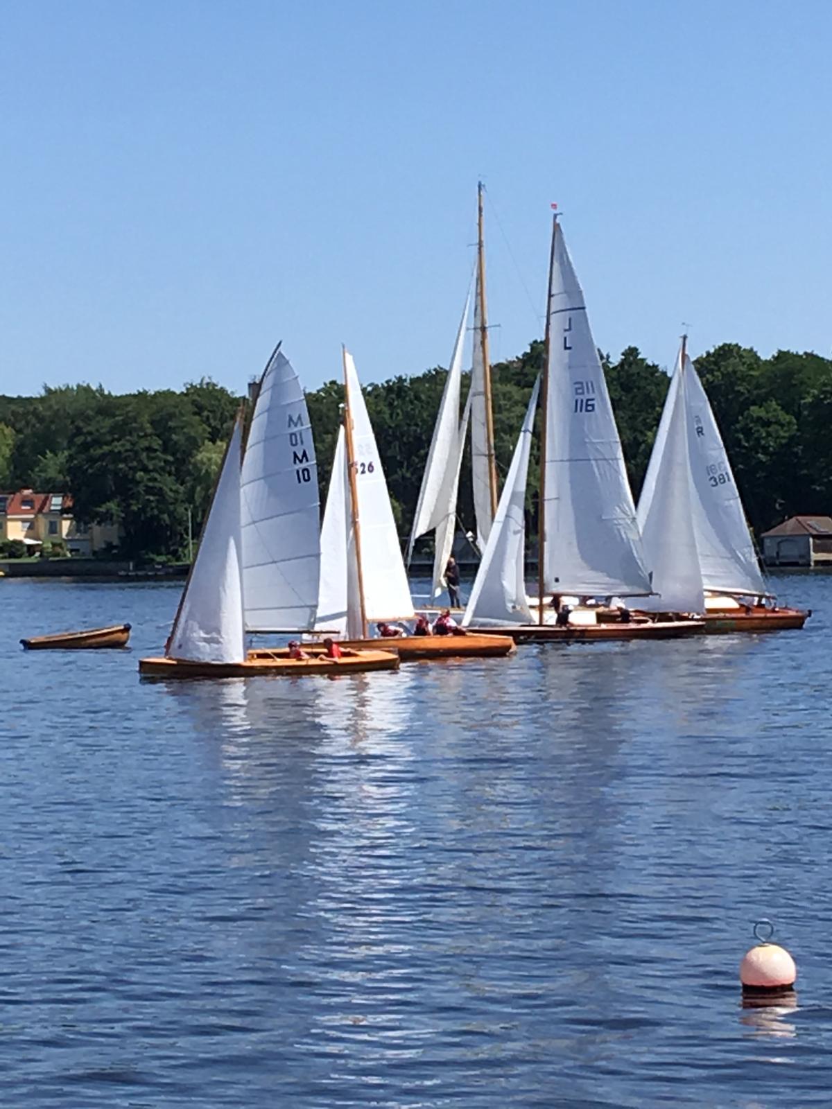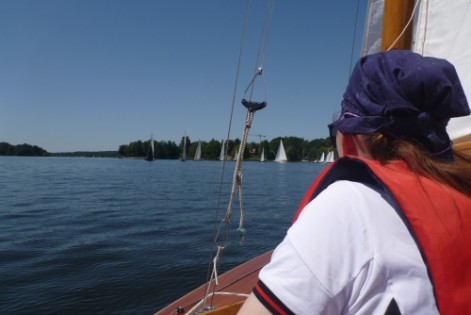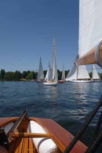 Nach dem Auslaufen hieß es aber erst einmal auf das Startschiff warten, dann mussten sich alle zur Registrierung zwischen Startschiff und Ufer durchquetschen – das erste Gewusel des Tages. Anschließend ging pünktlich zu 10.30 Uhr der Start über die Bühne. Wir erwischten einen ganz ordentlichen Start in der Mitte der Linie und konnten zunächst den Großteil des Feldes hinter uns lassen. Bei 1-2 Bft ging es gemächlich, doch stetig die Havel hinunter. Hierbei galt es die einzelnen Windfelder zu finden und so auszunutzen, dass man mit konstanter Fahrt voran kam. Das klappte mal besser, mal weniger gut. Aber nur bis auf Höhe des kleinen Breithorns. Hier begann das Feld aus Jollenkreuzern und aus den 10 Minuten später gestarteten Dickschiffen uns langsam einzuholen.