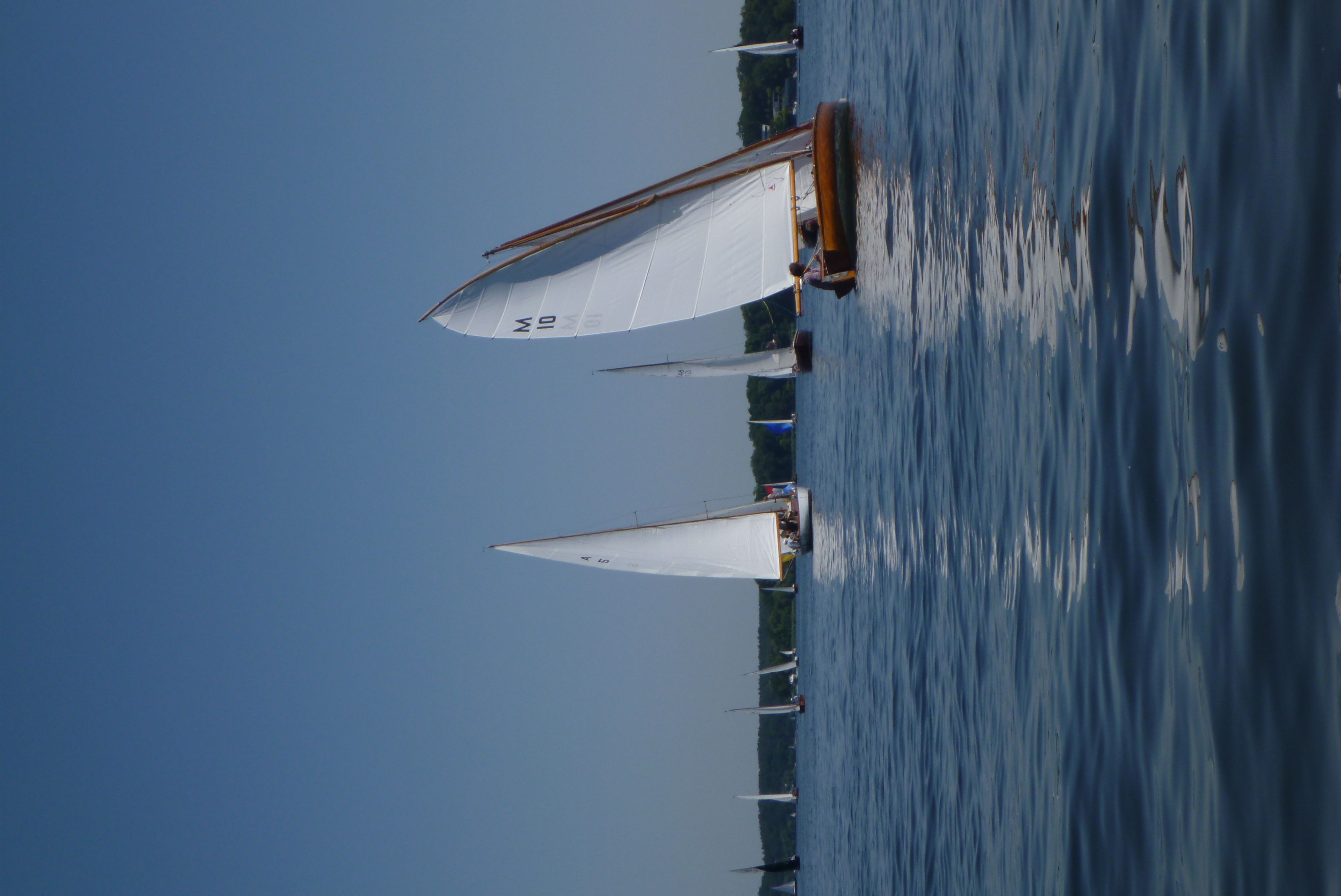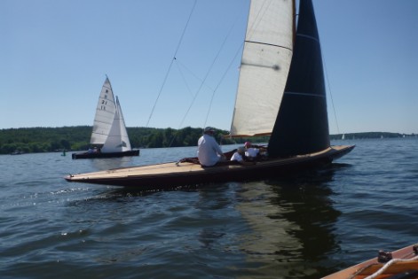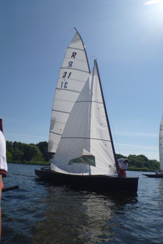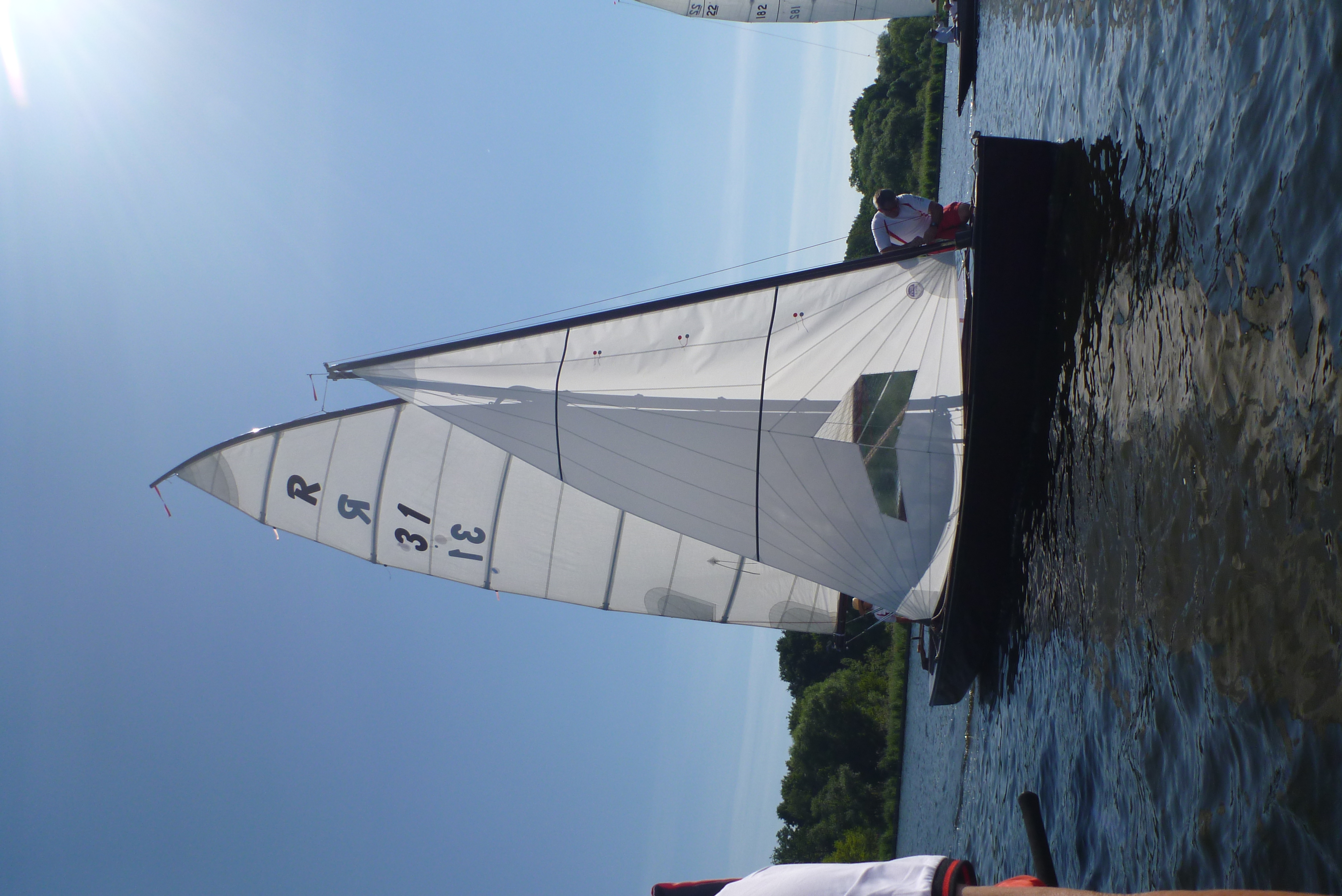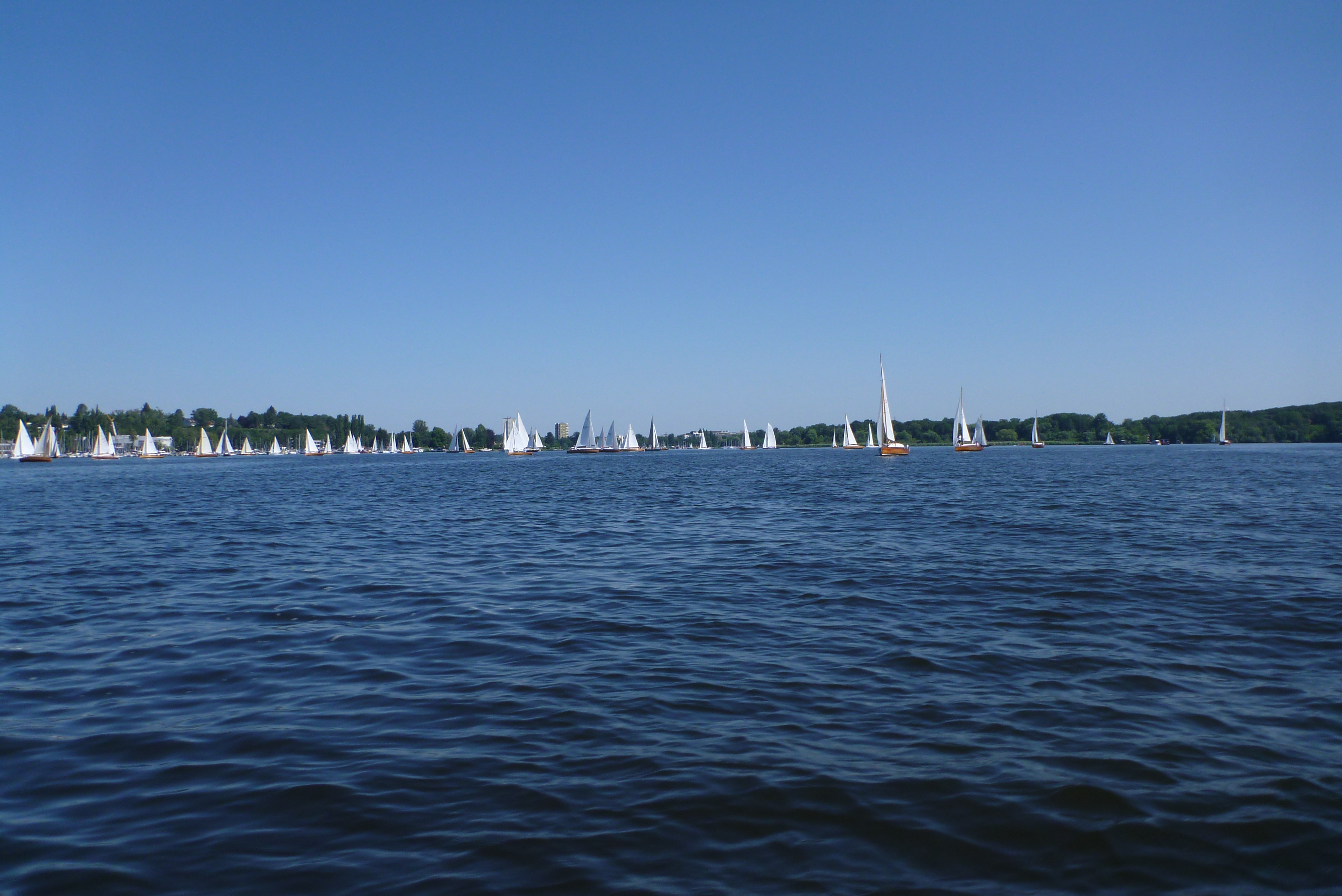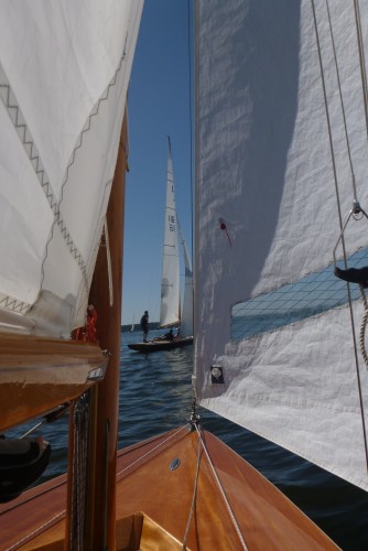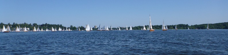 Nach dem Auslaufen hieß es aber erst einmal auf das Startschiff warten, dann mussten sich alle zur Registrierung zwischen Startschiff und Ufer durchquetschen – das erste Gewusel des Tages. Anschließend ging pünktlich zu 10.30 Uhr der Start über die Bühne. Wir erwischten einen ganz ordentlichen Start in der Mitte der Linie und konnten zunächst den Großteil des Feldes hinter uns lassen. Bei 1-2 Bft ging es gemächlich, doch stetig die Havel hinunter. Hierbei galt es die einzelnen Windfelder zu finden und so auszunutzen, dass man mit konstanter Fahrt voran kam. Das klappte mal besser, mal weniger gut. Aber nur bis auf Höhe des kleinen Breithorns. Hier begann das Feld aus Jollenkreuzern und aus den 10 Minuten später gestarteten Dickschiffen uns langsam einzuholen.