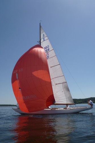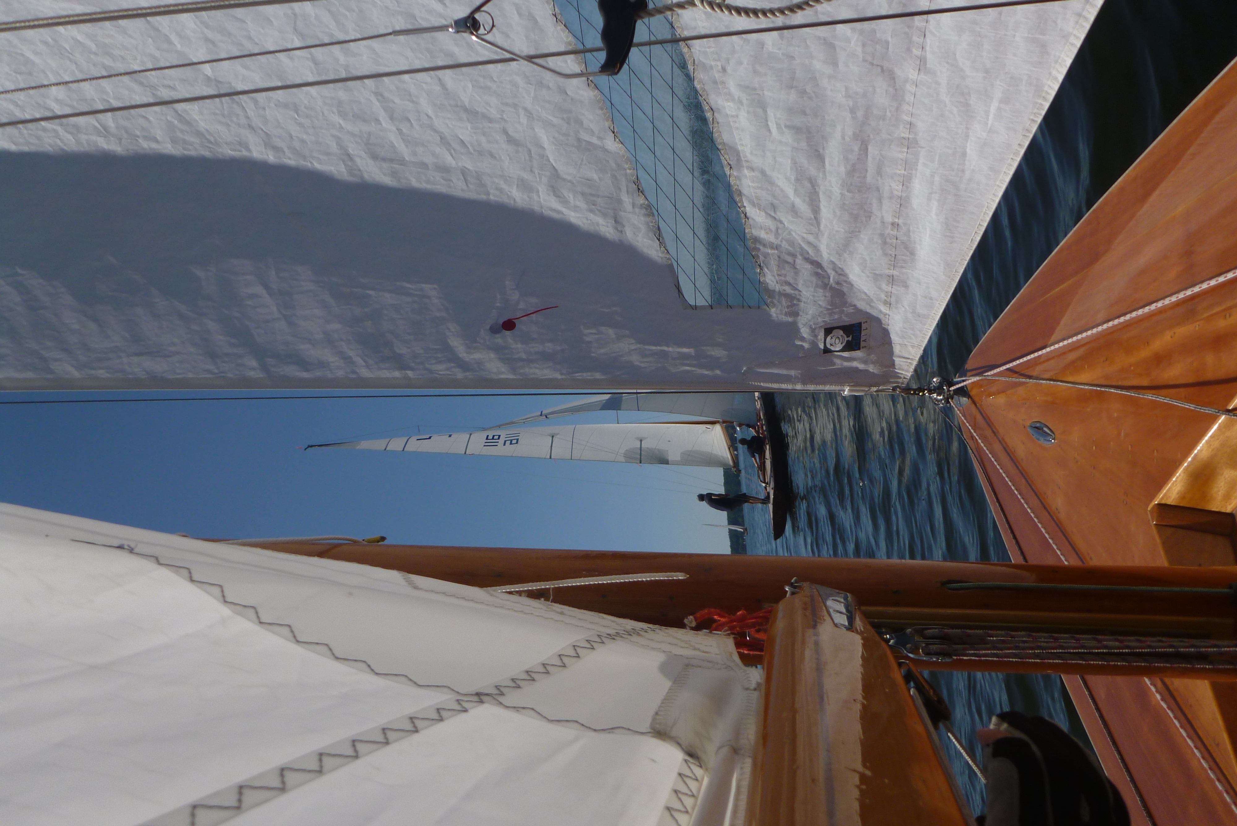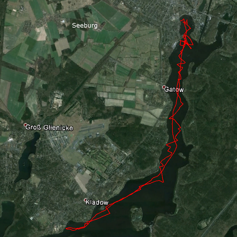 Je weiter wir aus der Kladower Bucht heraus kamen, um so besser stand dann unser Spi und mit einem auf Halbwind gefahrenen Spi konnten wir uns nach Norden arbeiten. Vor Kladow haben wir das erste Mal gehalst, dann wieder nach der Insel Lindwerder, das dritte Mal am kleinen Breithorn und zuletzt hinterm Grunewald. So konnten wir mit vorwiegend gut ziehndem Spi bis zur Einfahrt in die scharfe Lanke fahren. Die letzten Meter liefen wir dann fast parallel zu M10 Berlin Bill, einholen konnten wir ihn jedoch nicht.