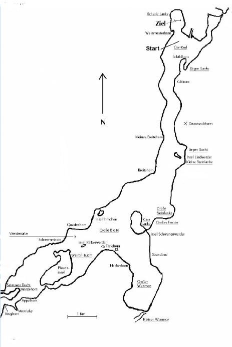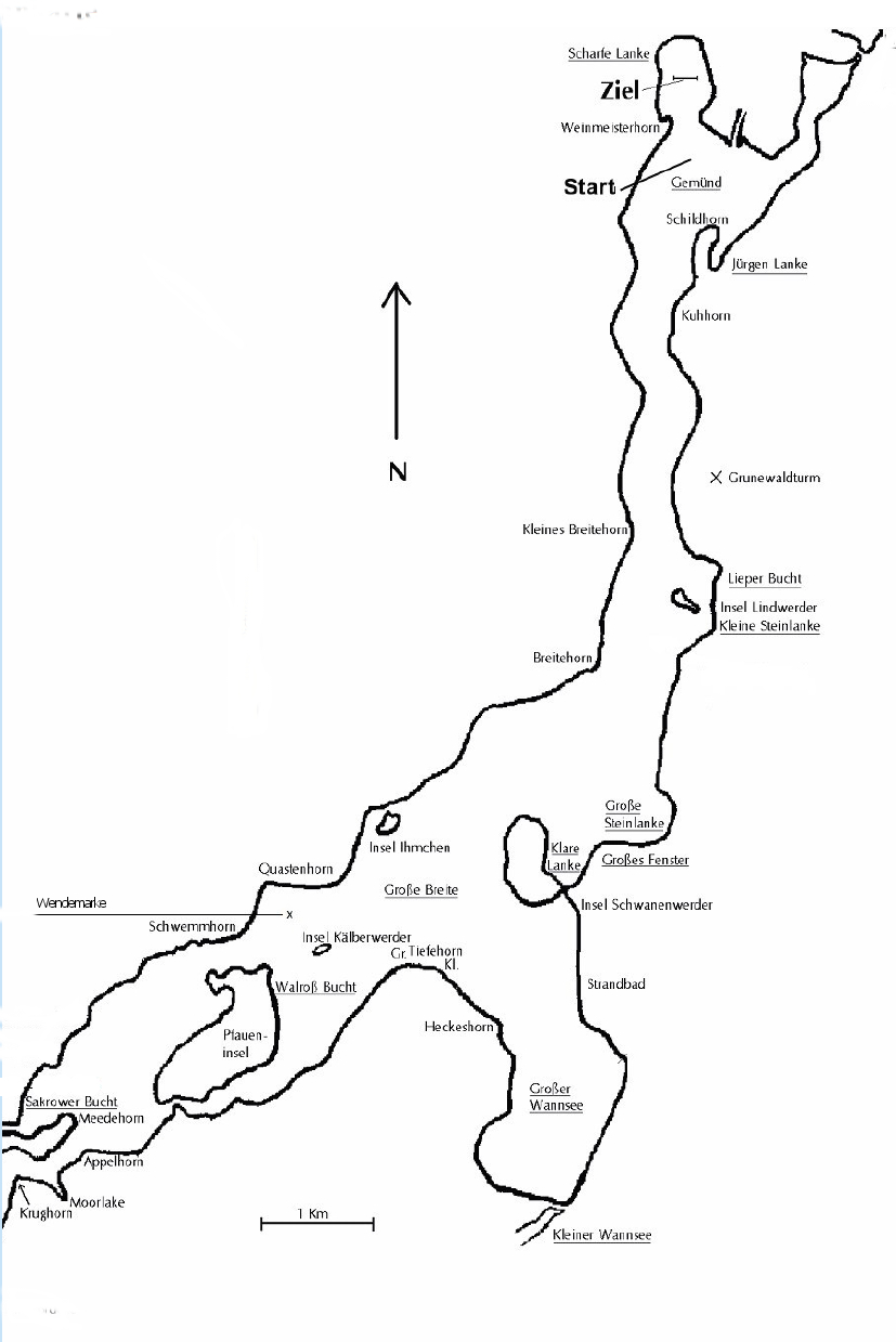 Der Kurs auf der Havel. Start in der Einmündung der Scharfen Lanke in die Havel, Ziel vor dem ASV an der scharfen Lanke.