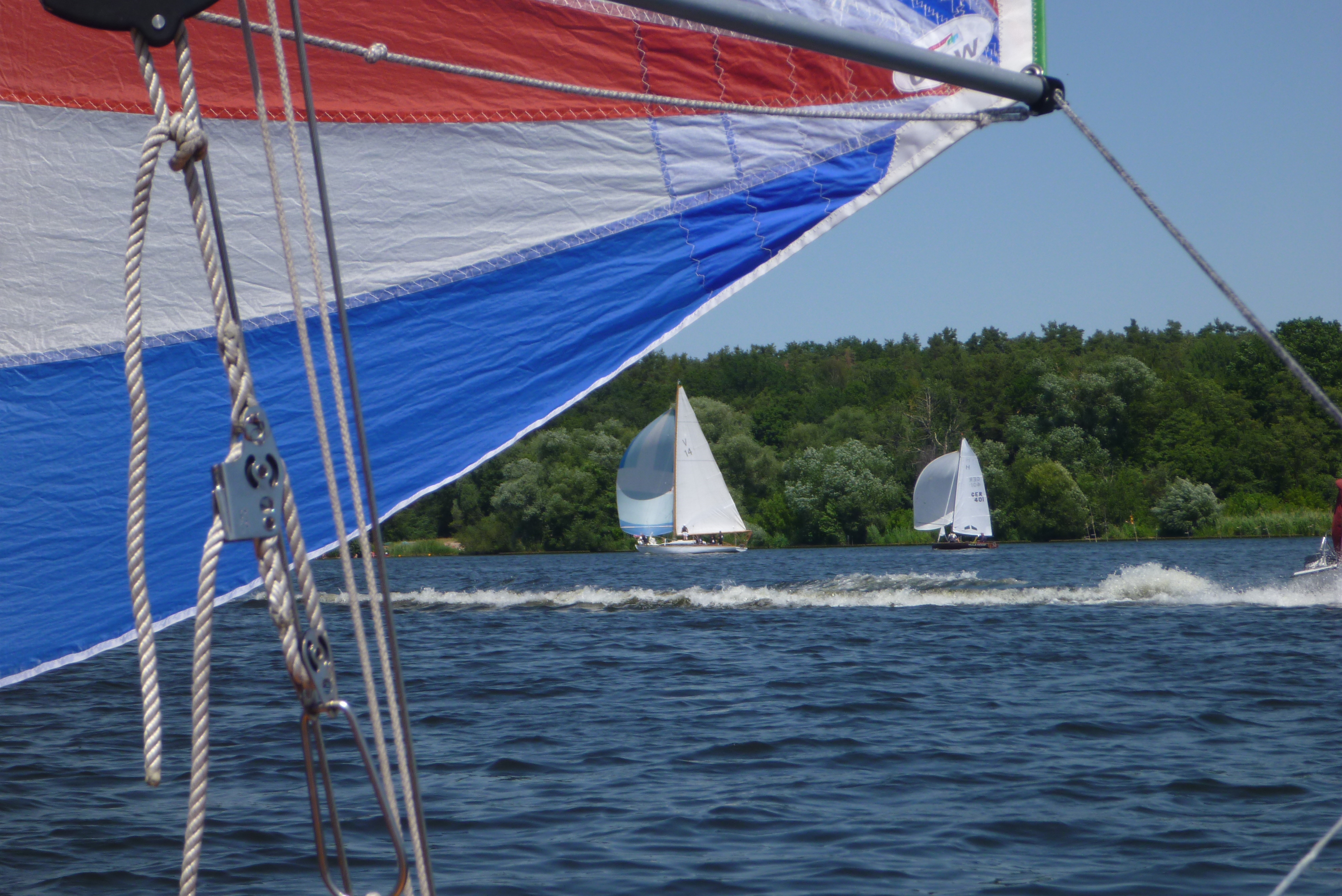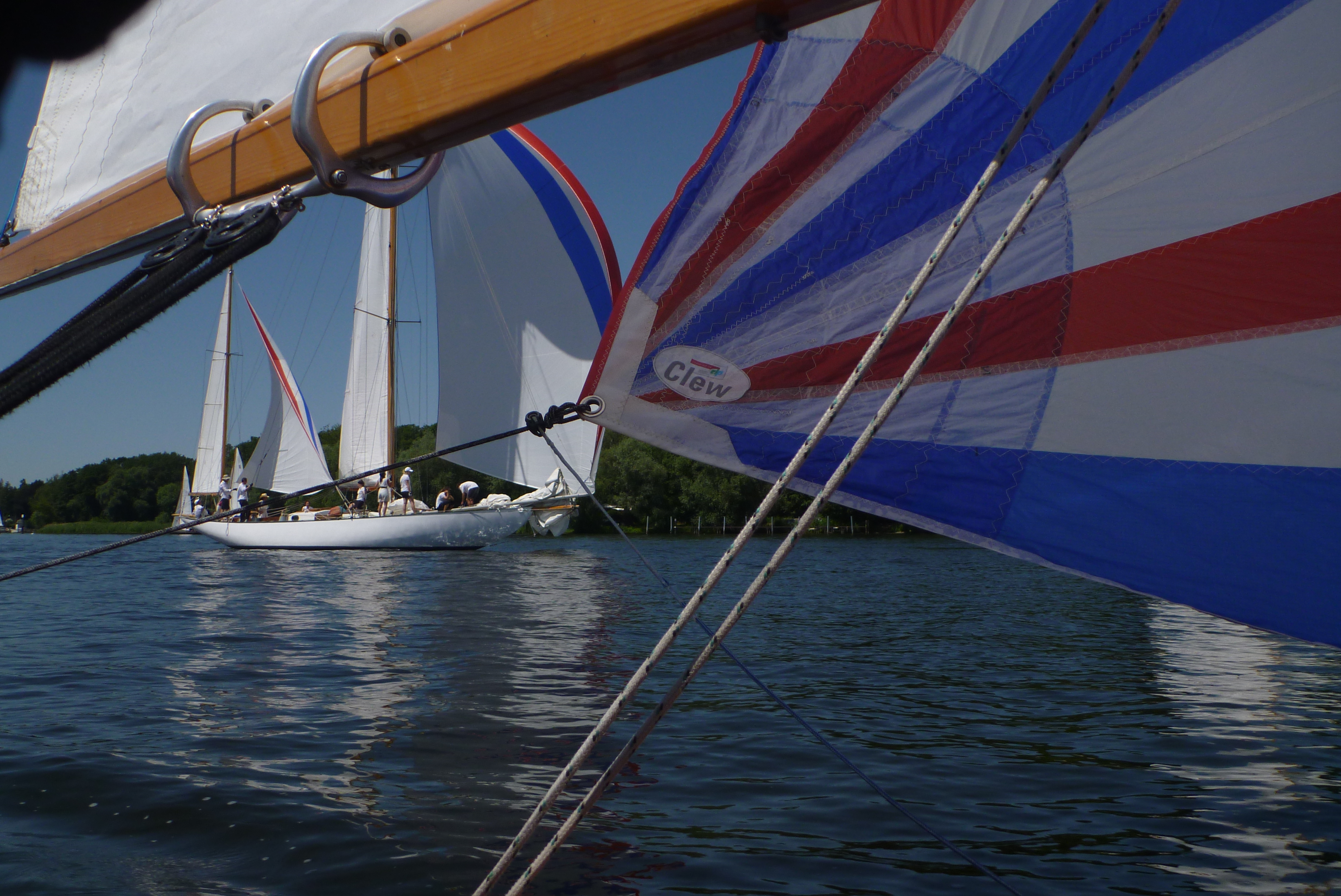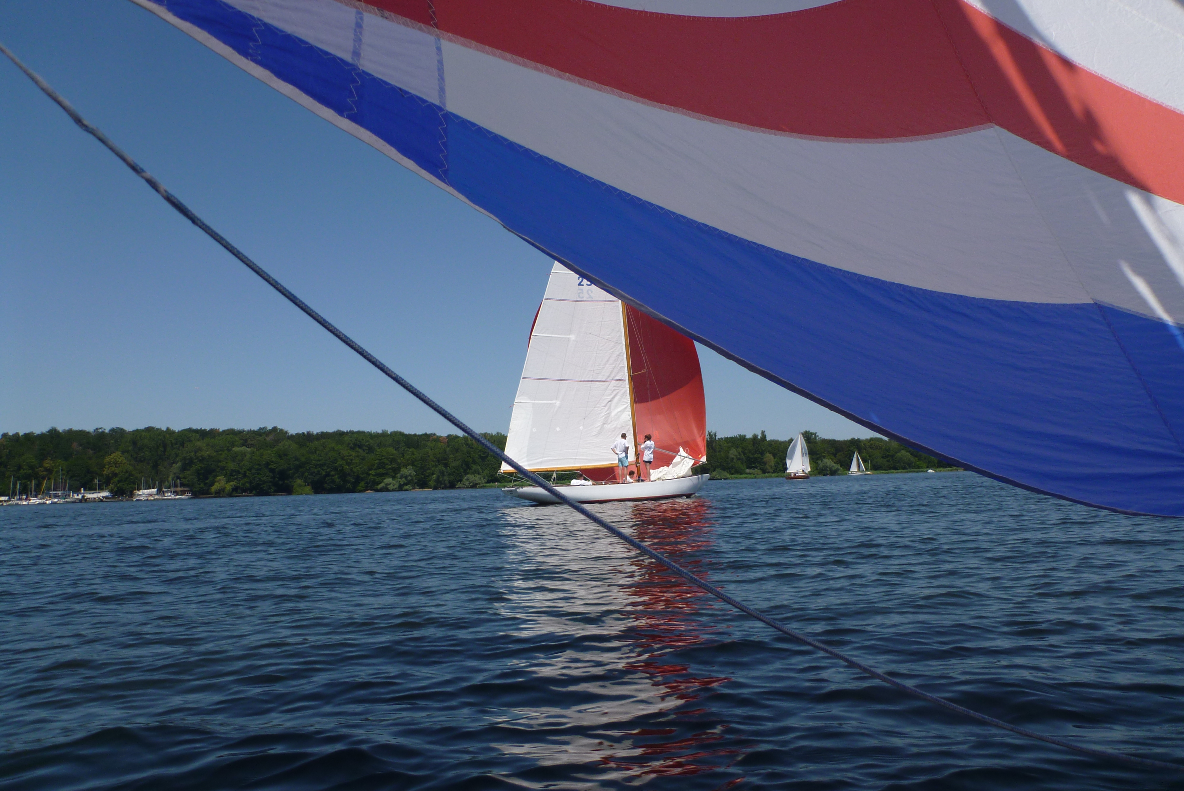 Das war noch der einfache Teil, aber dann von der Wendemarke wieder in den Windstrich im Havelfahrwasser zu kommen stellte sich als schwieriger heraus. Der direkte Weg zurück Richtung Norden bedeutete, dass man weiter in der Flaute unter Land blieb. Also versuchten alle mehr oder weniger Richtung Ostufer zu segeln. Die Spinnaker und Gennaker wurden zwar gesetzt, aber die standen zunächst nur sehr mäßig, mit dem Ergebnis, dass alle an ihren Vorwindsegeln zuppelten. Die Dickschiffe mit ihrem größeren Momentum waren dabei im Vorteil, da sie kleinere Flautenzonen durchlaufen konnten. So lag die Prosit V des ASV, die noch nach uns die Wendemarke gerundet hatte, bald mehrere Schiffslängen voraus.