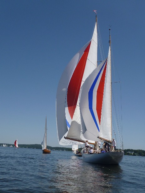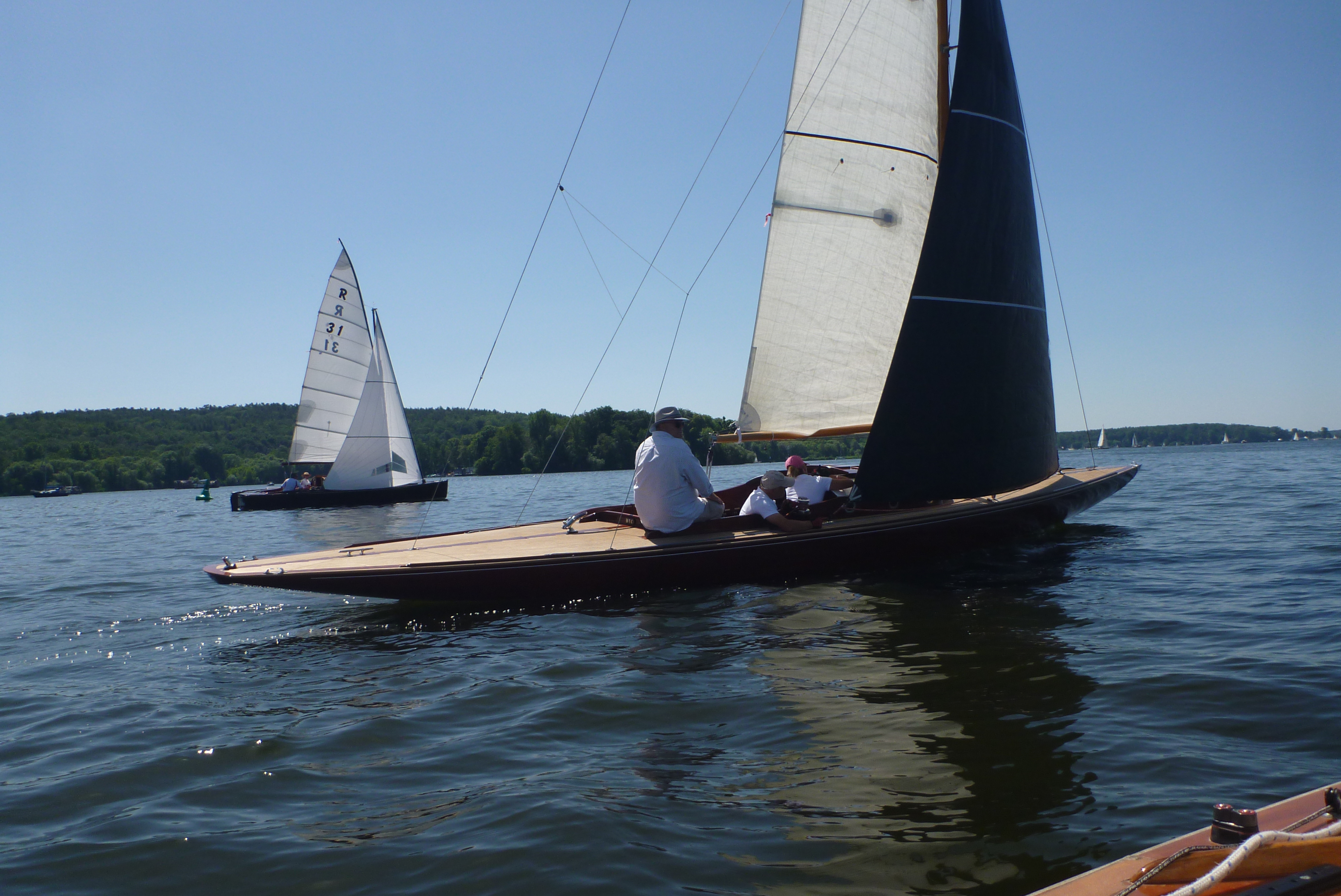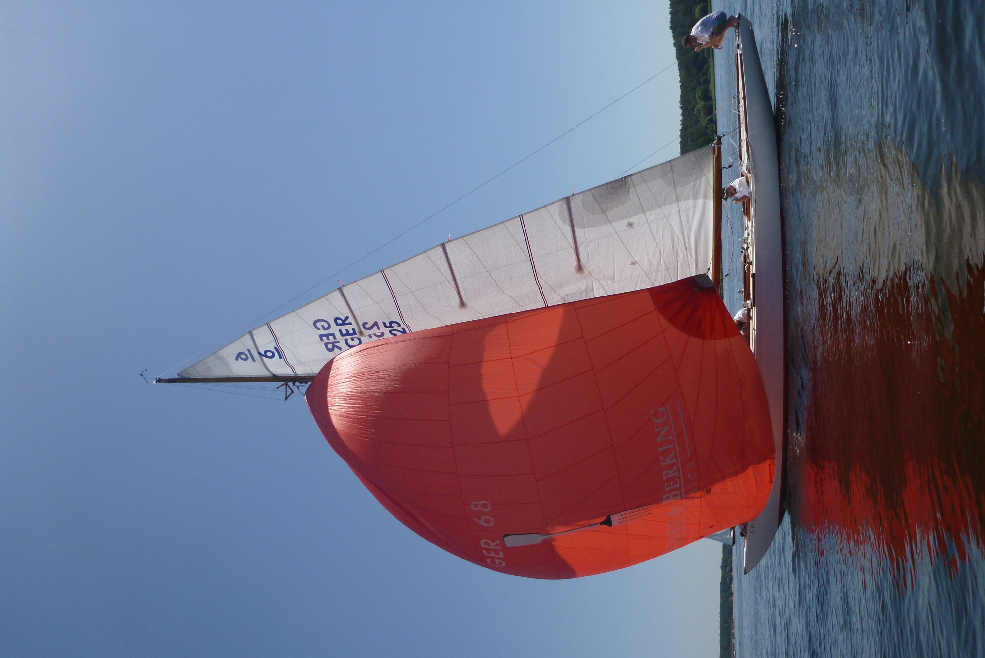 Das war noch der einfache Teil, aber dann von der Wendemarke wieder in den Windstrich im Havelfahrwasser zu kommen stellte sich als schwieriger heraus. Der direkte Weg zurück Richtung Norden bedeutete, dass man weiter in der Flaute unter Land blieb. Also versuchten alle mehr oder weniger Richtung Ostufer zu segeln. Die Spinnaker und Gennaker wurden zwar gesetzt, aber die standen zunächst nur sehr mäßig, mit dem Ergebnis, dass alle an ihren Vorwindsegeln zuppelten. Die Dickschiffe mit ihrem größeren Momentum waren dabei im Vorteil, da sie kleinere Flautenzonen durchlaufen konnten. So lag die Prosit V des ASV, die noch nach uns die Wendemarke gerundet hatte, bald mehrere Schiffslängen voraus.