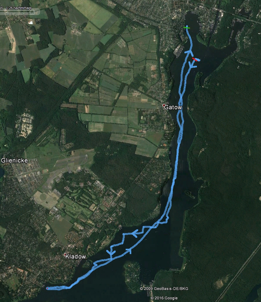 Der Spi steht gut, und so geht es zunächst recht zügig havelabwärts. Dabei orientiere ich mich am rechten Ufer, was sich aber später als Fehler errweist: Durch den konstanten Abstand vom Westufer fahre ich nördlich von Kladow in die Flaute, während der Restwind Richtung Schwanenwerder zu finden gewesen wäre.