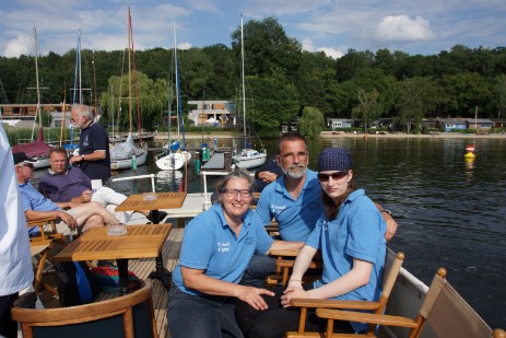 Um ½ Fünf geht’s dann mit der Luxusyacht „Fitzgerald“ zum BYC. Dort sitzen wir erstmal mit Alsterwasser (wenn ein Alsterwasser als Freibier ausgeschenkt wird, ist es dann Freiwasser???) in der Abendsonne und schnacken, dann gibt es erst die Siegerehrung und dann Abendessen. Anschließend sitzen wir noch alle in der Abendsonne am Wannsee bis es gegen Neun Uhr mit der Lieselotte zurück zum VsaW geht. War der Hinweg luxuriös, so ist der Rückweg um so bodenständiger: Als alter Hamburger Hafenschlepper aus den 20er Jahren mit Orginalmotor und Orginalausstattung ist auf der Liselotte Dämmung ein Fremdwort – man, ist die laut!