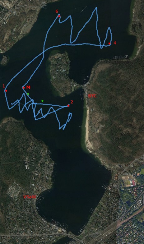 Der zweite Start verläuft ähnlich: Wieder einmal sind wir spät dran, diesmal liegt die 1 etwas weiter Richtung Kälberwerder. Dann geht es wieder um Schwanenwerder zur 4 , hier wird zunächst ein kurzer Schenkel 6-4-6 gesegelt und erst anschließend geht es um Schwanenwerder zur –M– und von da um das Schwanenwerder Flach herum zu Tonne 2.