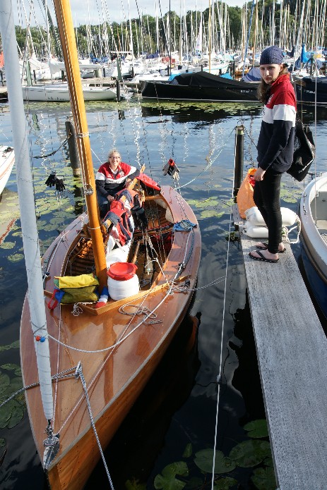 Entspannt segeln wir zum Abschluß zum VsaW und legen uns dort in die zugewiesene Box. Nach dem Festmachen wird aufgeklart und wir schälen uns aus den Regenklamotten raus: Die beiden Mädels sind naß, ich bin trocken. So als Steuermann provitiert man eben von den beiden Wellenbrechern voraus.