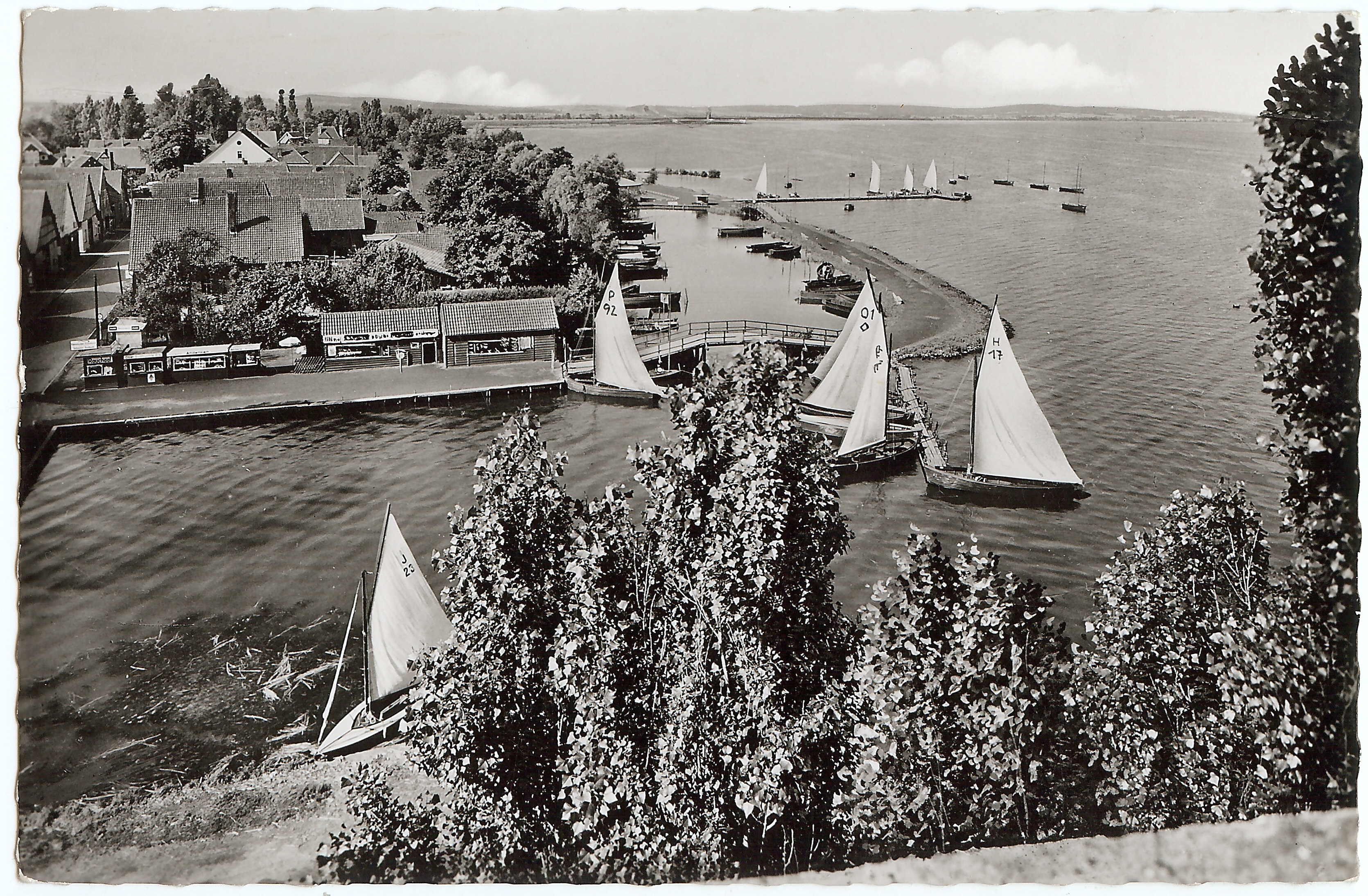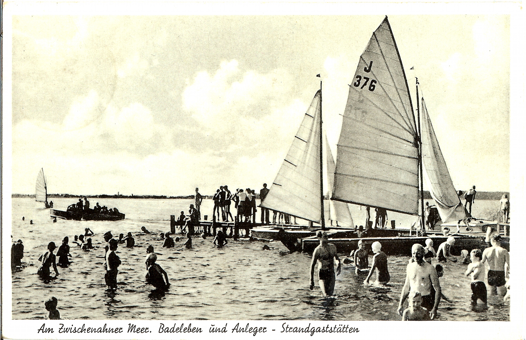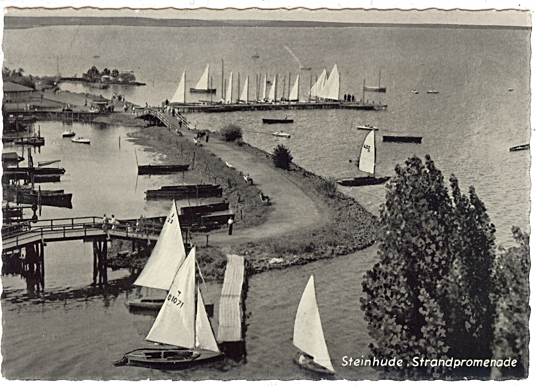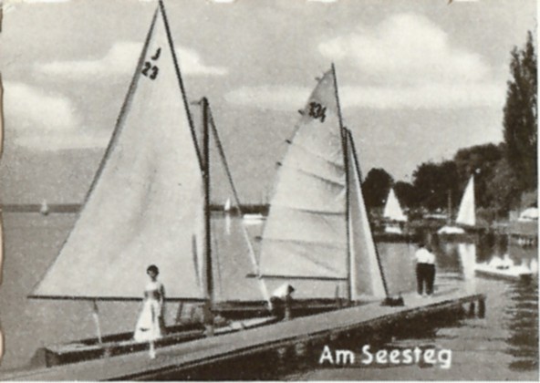 Noch einmal die unbekannte J-Jolle J 23 am Steg am Steinhuder Meer, Zeitpunkt der Aufnahme unbekannt. Photographie: Verlag Glanz Karte?, Karte ungelaufen
