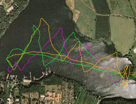 Der Kurs der Christl bei der ersten Sommerregata: Start von Ost nach West, erst gelb, dann grün, dann Lila.