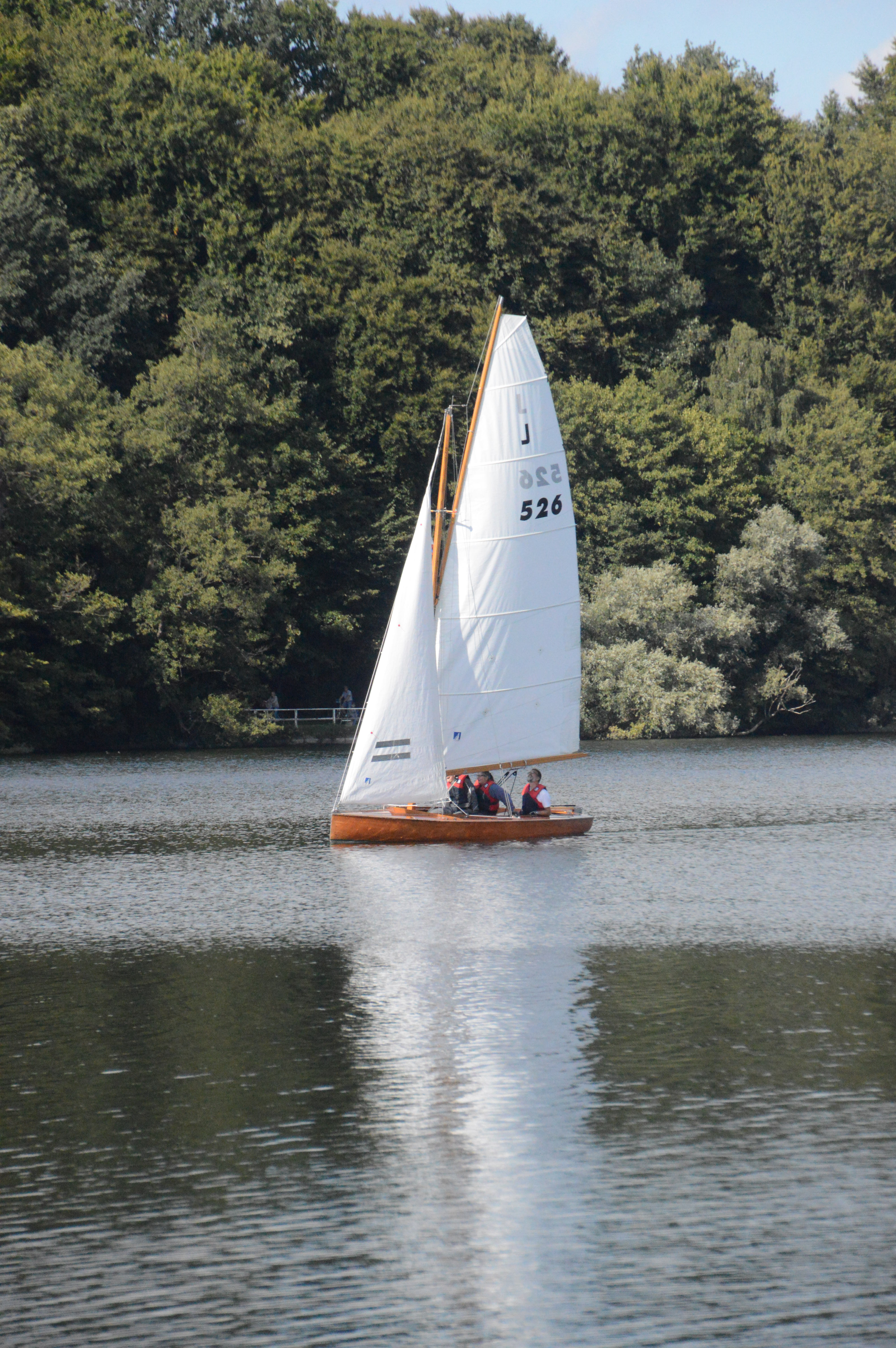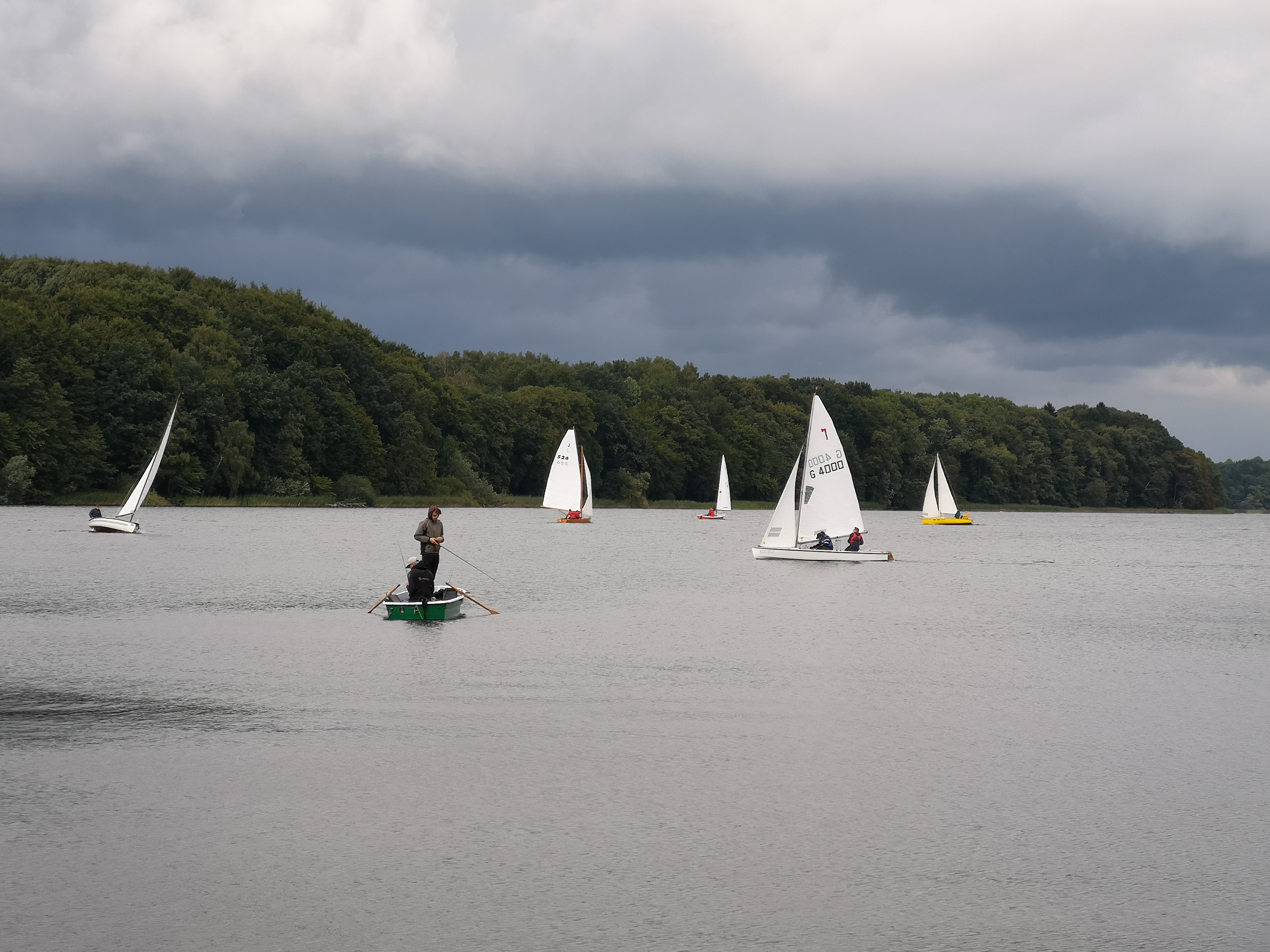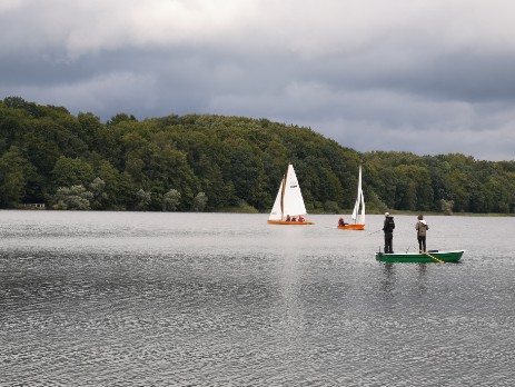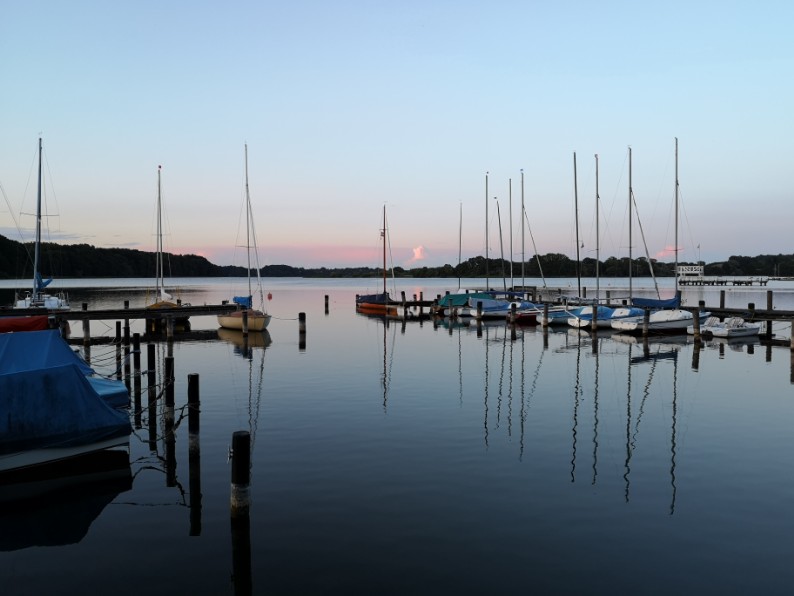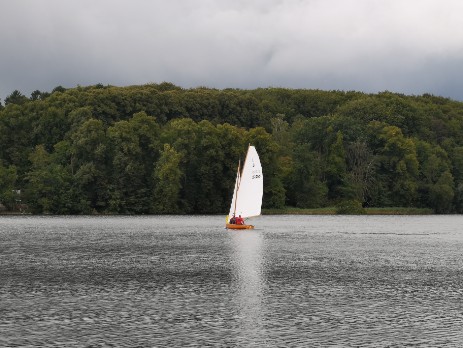 Zügig geht es Richtung Stipsdorf, bis wir kurz hinter dem SSC in eine Flautenzone eintauchen, aus der wir uns nur mit zwei Halsen befreien können. In der Stipsdorfer Bucht ist nicht so viel Wind, aber es reicht. Wir halsen um die Tonne und segeln dann am Wind wieder Richtung Spitzenort. Leider kann ich nicht ganz Spitzenort anliegen, auch hier ist ein Holeschlag notwendig, dann können wir auf Steuerbordbug Spitzenort runden und anschließend raumschots bis vor dem Wind in den nördlichen Seeteil segeln. Hinter der Untiefe halsen wir wieder und haben dann einen schönen Raumschot-Anlieger auf die Tonne bei Erdmann zu. Die anderen folgen uns, aber im Gegensatz zu uns segeln sie alle einen platten Vorwindkurs östlich der Untiefe vorbei. Flora hat den Rest schon überholt, sie wird von Lumpi und Emma verfolgt.
