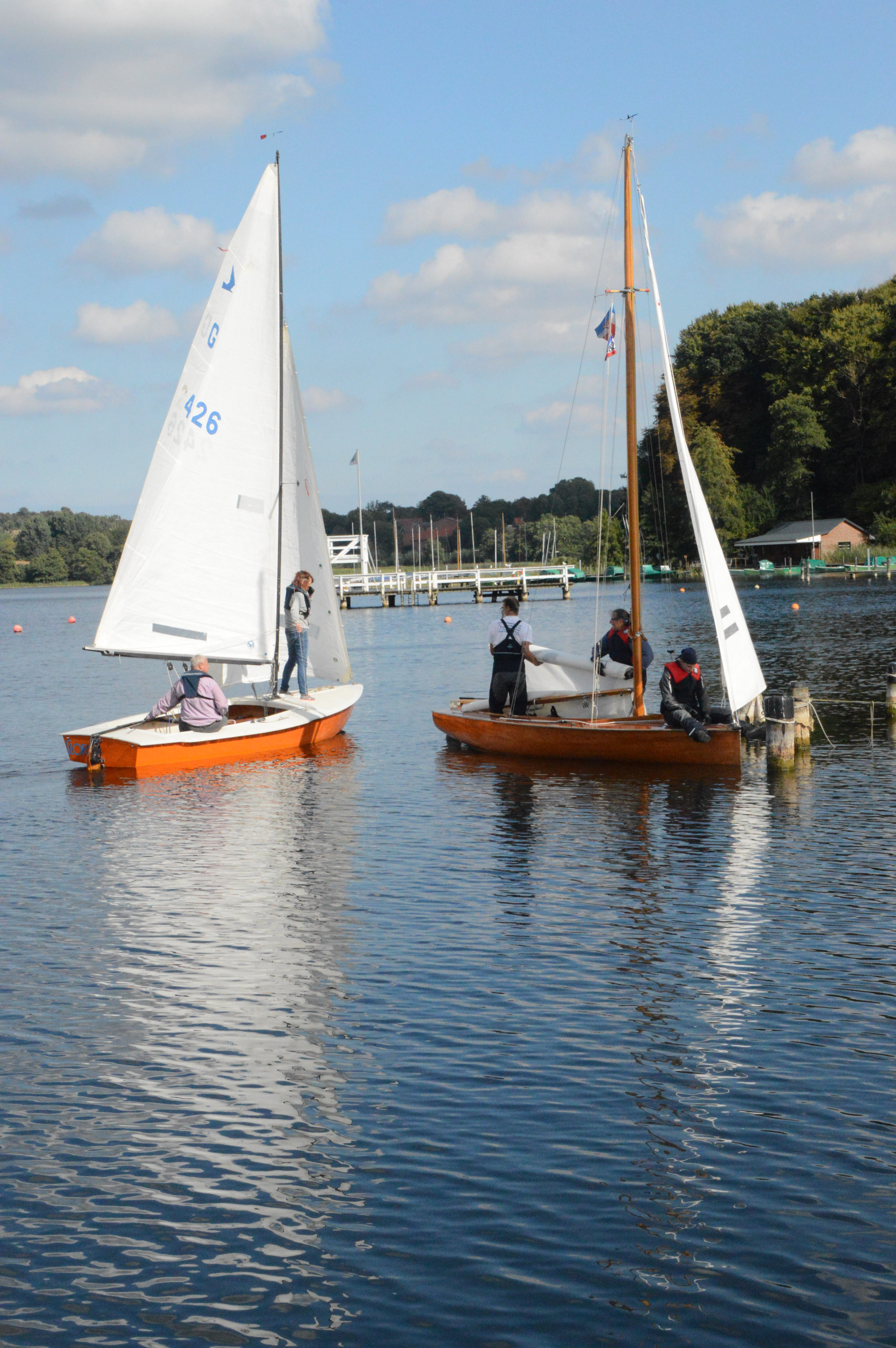 Zur verabredeten Zeit versammeln sich 5 Mannschaften um den Regattaleiter Jörg: Winfried und Holger sind auf Winnis Jeton dabei, Conni und sein Tochter machen die Flora, den ehemaligen Zugvogel des SBV, klar, Maria und Michael Kliever segeln ihren Conger Aquilla und Renate, Larissa und ich riggen Christl auf. Und zu guter Letzt schickt sich Jörg Sohn Jan an, auf seinem Optimisten mit zu segeln.