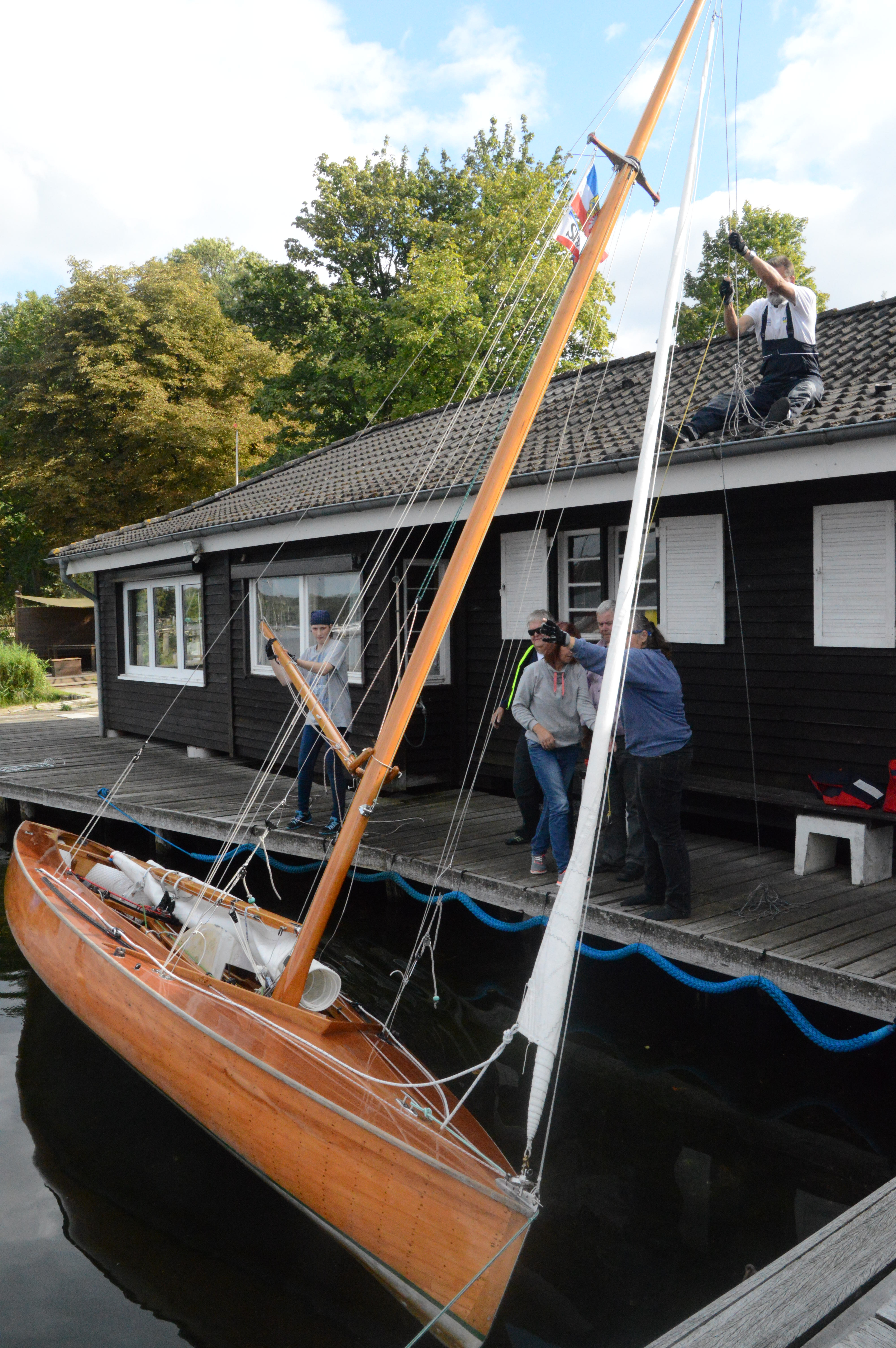 Also verholen wir Christl zum Haus, kleben alle Decksdurchlässe ab und ich klettere auf’s Dach. Auf Höhe des Mastes. Dann wird Christl gekrängt und ich komm recht bequem mit 2 freien Händen an das Masttop an. Hier kann ich das Pieckfall abschneiden und die Gaffel wird mir abgenommen. Dann tape ich die Spischot an die verbliebene Seele des Piekfalls und vorsichtig wird die Spischot in den Mast gezogen, bis die Tape-Stelle unten an der Rolle stockt. Dann wird Christl wieder aufgerichtet.