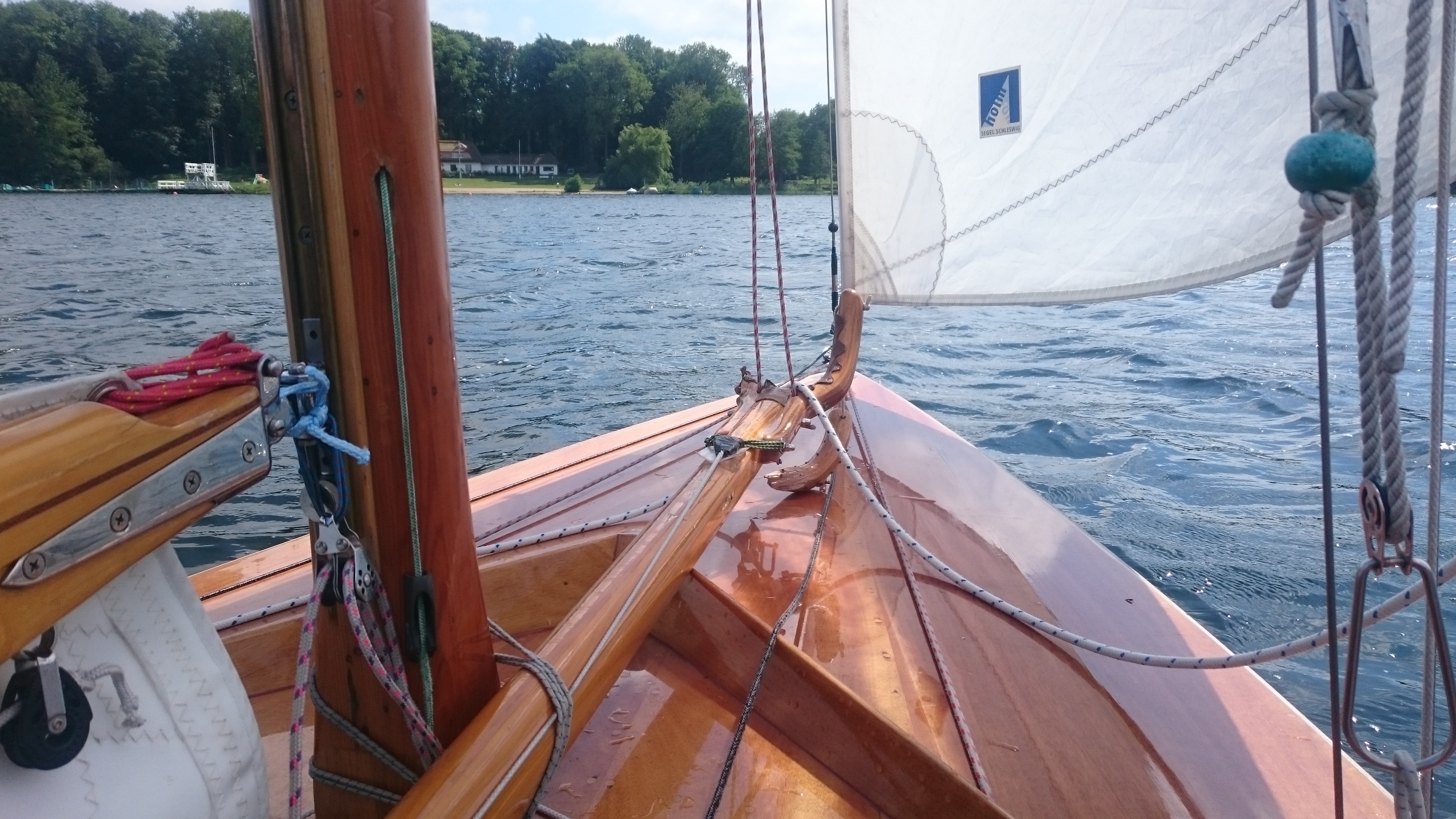 Nun zurück kreuzen. Die Speed ist ordentlich, die Wendewinkel (und damit die VMG) sind unter aller Kanone. Mit Wendewinkeln unter 45° wird man halt nix. Die Fock steht schlecht, sie hängt ziemlich durch. Zusätzlich kommt das Pickfall ruter und muß erst wieder durchgesetzt werden. Wir quetschen uns eng an Spitzenort vorbei in Richtung Tonne bei Stipsdorf.
