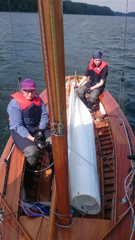 Also schnell an Bord und das Segel gesetzt – Das Piekfall hat sich an der Gaffelnock verklemmt. Ergo: Gaffel und Segel müssen wieder runter, gerade so komme ich an die Gaffelnock an und kann den Schäkel verklaren, dann geht alles wieder hoch. Das Groß steht gut. Nach dem Auslaufen entrollen wir dann die Fock und die Fock steht: Sch…. Im oberen Bereich hat sich die Fock nicht entrollt, das Vorstag hat sich mit eingerollt. Unten steht sie ordentlich, oben fällt die Fock in Sachen Vortrieb komplett aus.