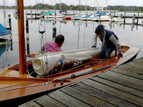 Nach dem Zieldurchgang fahren wir in unsere Box, drauf eingerichtet die Fock zu verklaren – was auch klappt. Aber irgendwas ist immer: Heute: Die Gaffel kommt nicht ‘runter, das Piekfall hat oben an der Rolle geschamfielt und der Mantel ist in den Mast zurückgerutscht und verhindert nun, dass sich die Gaffel herunterholen lässt.