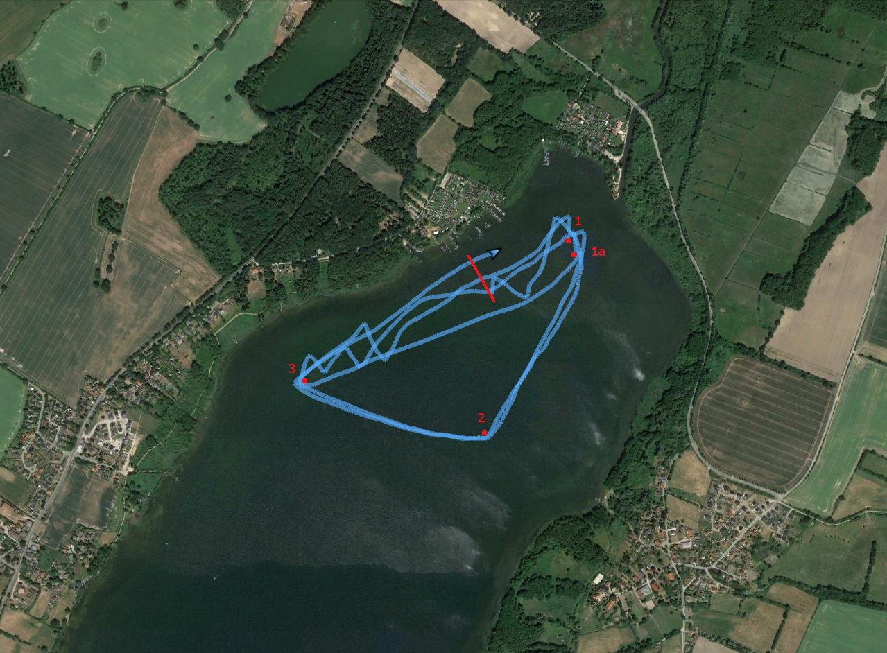 Pünktlich um 12 beginnt die Steuermannsbesprechung, es wird als erstes ein Dreieckskurs gesegelt werden: Start - 1/1a – 2 - 3 – 1/1a - 3 – 1/1a - 2 - 3 – Ziel (s. Kurs 1).