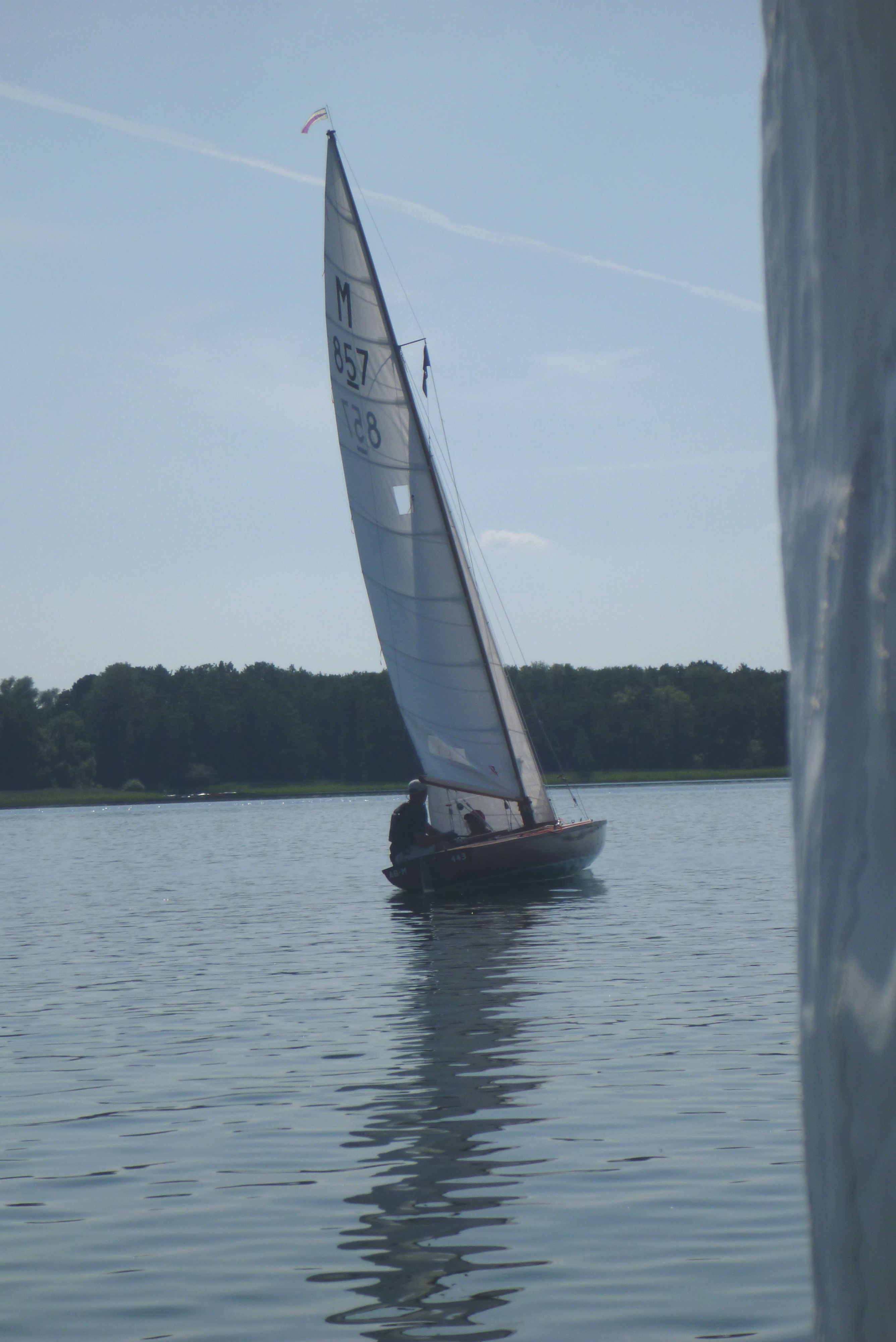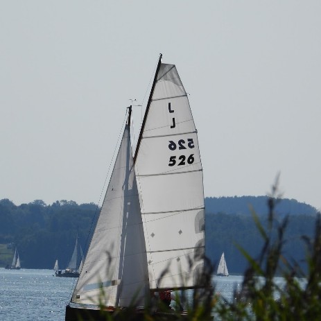 Wir starten wieder Richtung Rothenhusen, diesmal schaffen wir es, nach dem wir wieder zu spät an der Linie sind, nach Osten wegzuwenden und uns von den Jollis abzusetzen. Nach Runden von Tonne 1 und Ablauftonne 1a ziehen wir den Spi auf Steuerbordbug. Der Wind kommt längs des Ostufers, gerne etwas zu weit aus Steuerbord – um nicht zu Übergeigen muss ich immer wieder nach Backbord abfallen und in den Winddrehern dann wieder nach Steuerbord fahren, um die Landzunge gegenüber von Buchholz zu schaffen. Doch peu à peu holen wir auf die Rennjolllen-Gruppe vor uns auf. Dann dreht der Wind weiter und wir halsen, wie die Boote vor uns, auf Backbordbug. Der Wind frischt in Böen etwas auf, aber alles bleibt gut zu händeln.