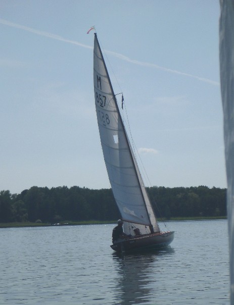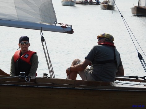 Nachdem das Epoxy 1 h getrocknet ist, laufen wir aus. Manfred variiert erst mal die Gaffelstellung, die Vorlieckspannung und die Unterlieckspannung (alles loser) . Dann nehmen wir noch den Schäkel an der Gaffelklau heraus, das Segel bekommt so insgesamt etwas mehr Bauch. Den Genuaholepunkt fahren wir weiter hinten. Noch die Gaffel etwas tiefer für ein loses Vorliek und dann kann es losgehen.