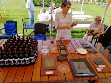 Bei der Siegerehrung gibt’s nicht nur den Schanzenberg-Wein für den 15. Platz, sondern auch noch die Plakette für die schnellste (einzige) J-Jolle. Larissa bekommt für ihren 14. Platz bei Ronald ebenfalls ihr Fläschchen.