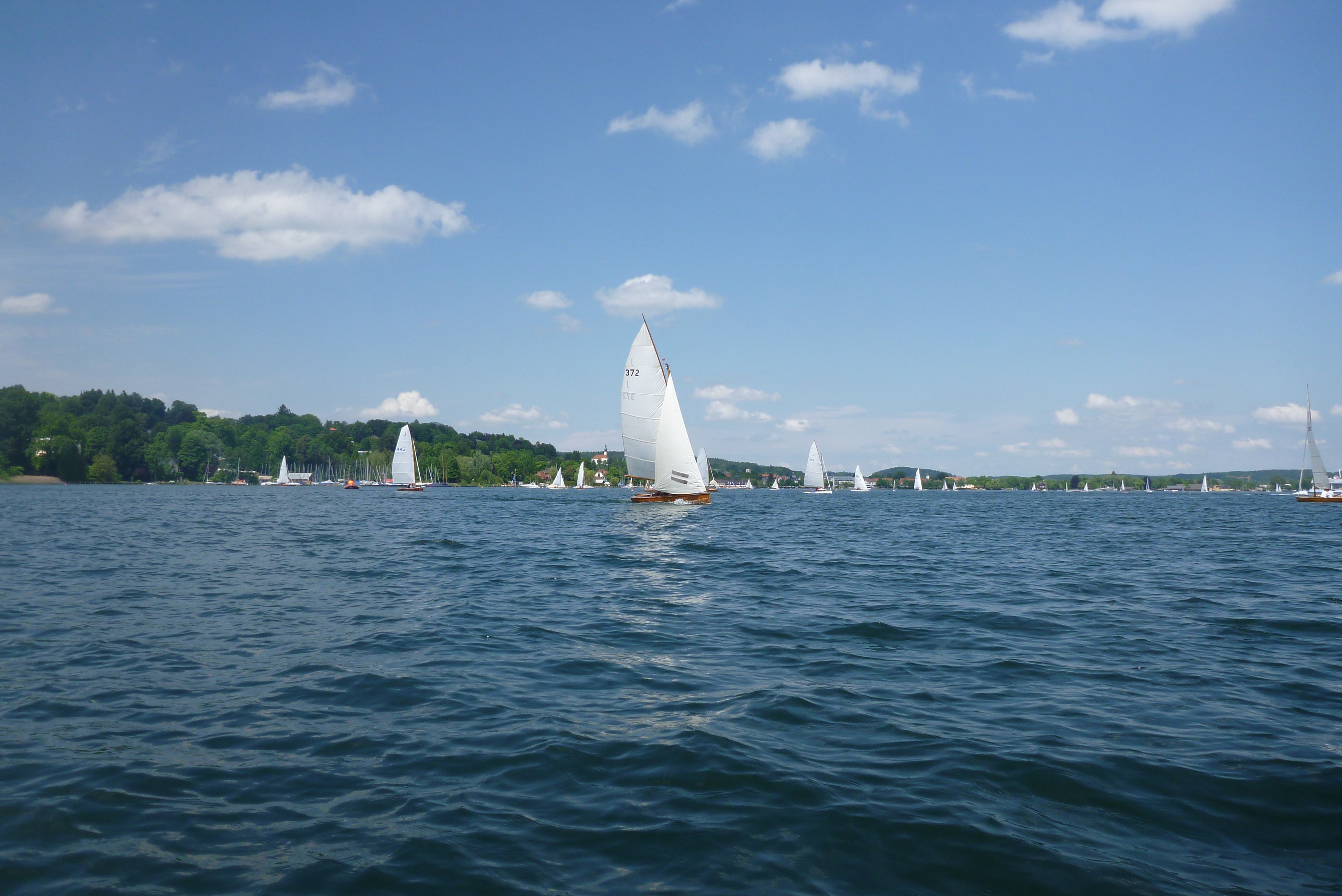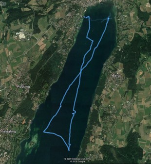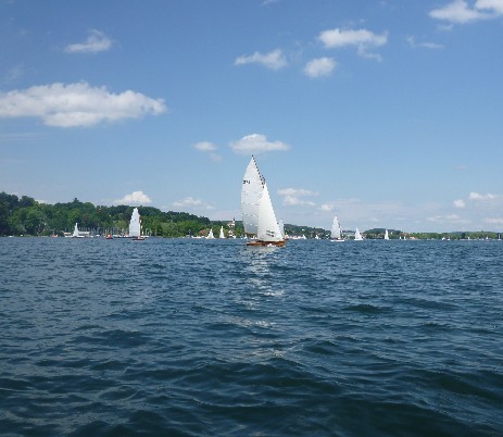 Beim Einsegeln und Warten auf das Vorbereitungssingnal bricht auf der J 503 "FünfNullDrei" das Fockfall und sie muss zurück in den Hafen. Wir anderen starten von der NO-Ecke des Sees (da, wo die Würm den See verläßt) Richtung Roseninsel. Von dort aus geht der Kurs quer über den See bis zur Tonne vor Allmannshausen und dann wieder Richtung Norden zurück zum MRSV.