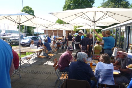 Wir versuchen es auf dem Halbwindschlag mit dem Spi, aber das klappt bei uns mit verdrehtem Fall nur mäßig gut und der Wind kommt zu vorlich, daher nehmen wir nach der halben Strecke zur Tonne am Ostufer den Spi wieder weg - Schadensbegrenzung. Wir runden die Tonne als drittletzte.