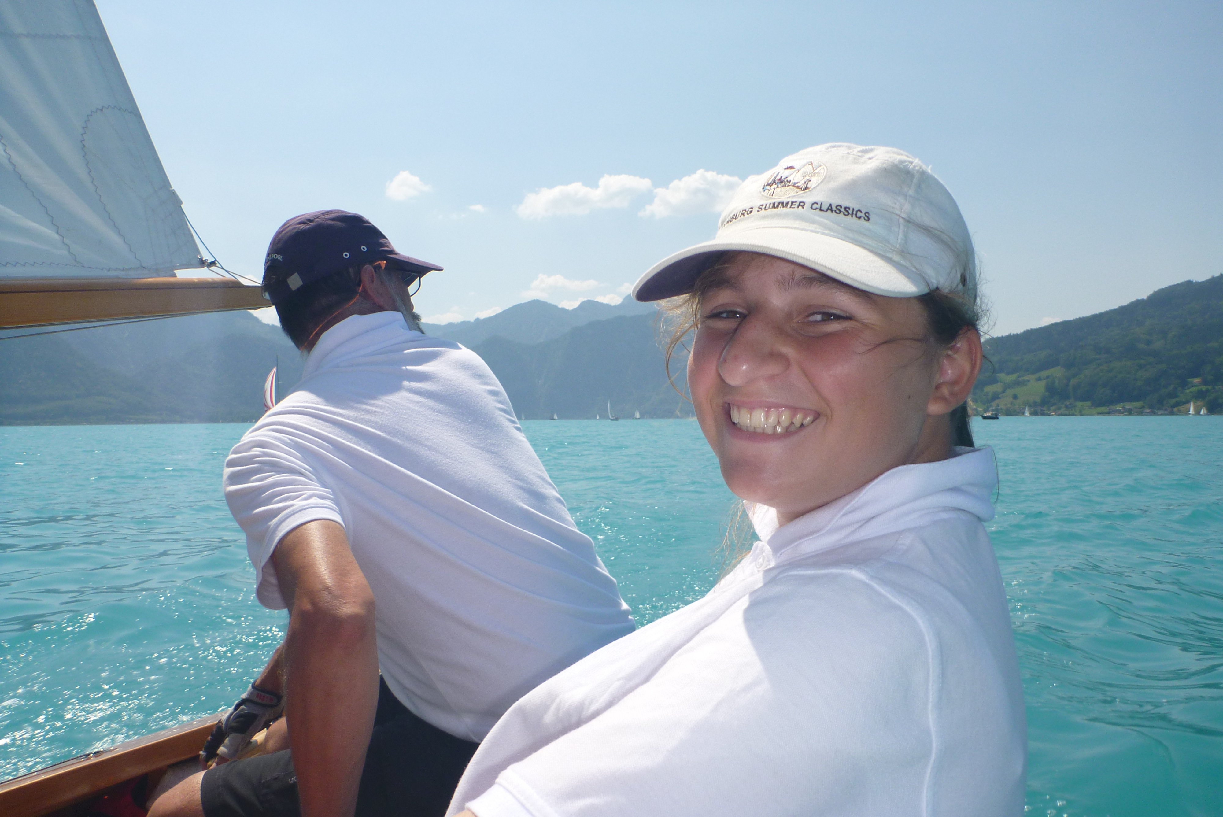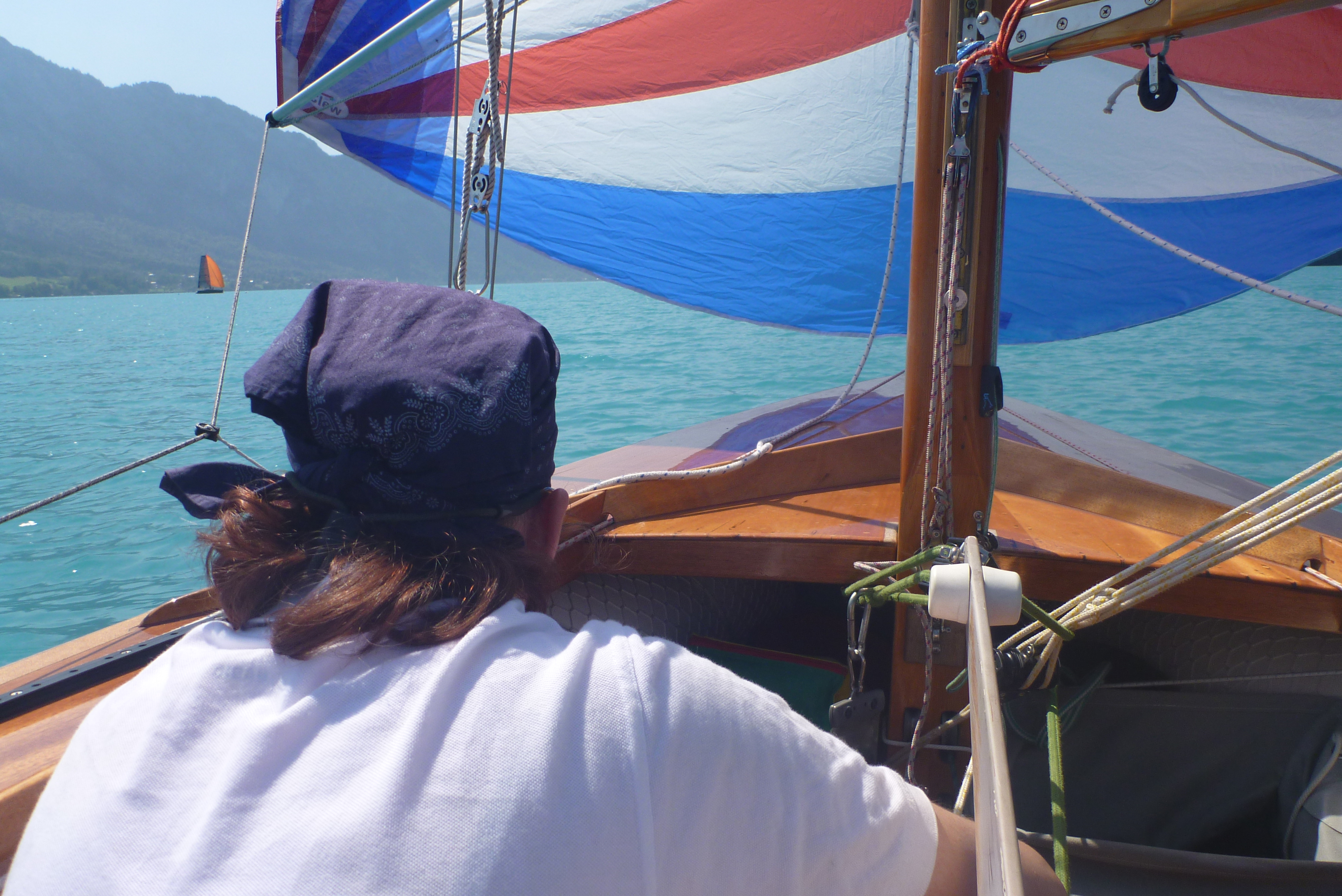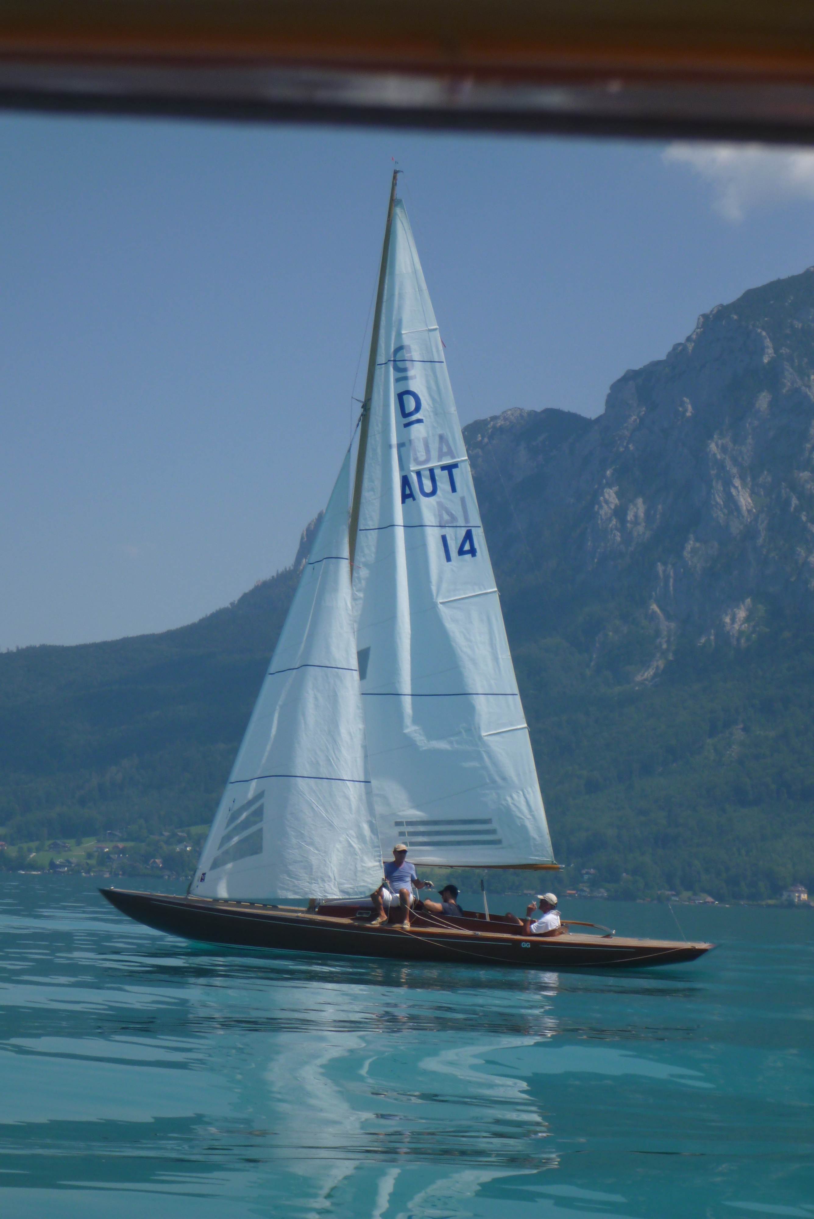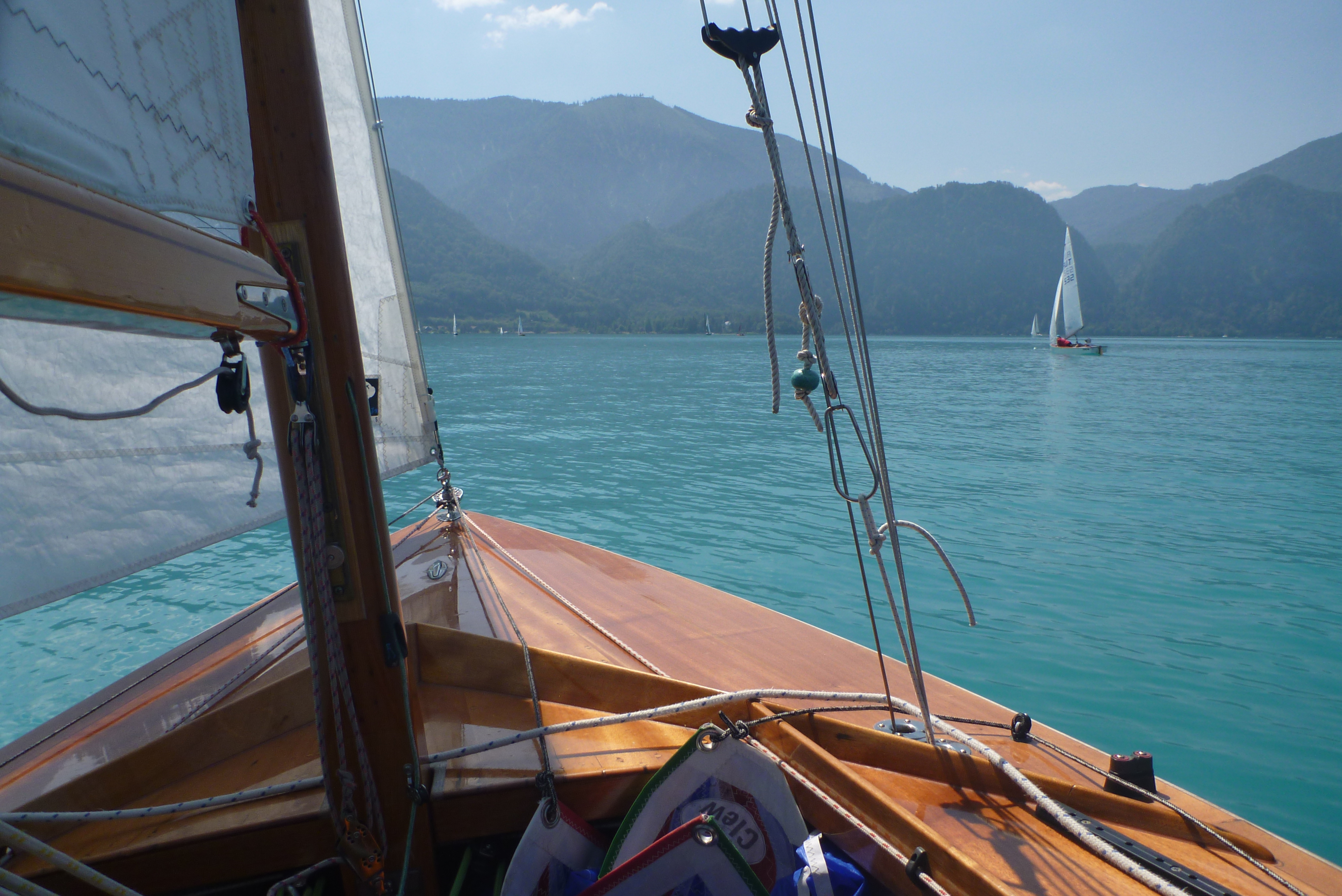 Auf dem Weg zur Tonne sind wir auf Sylvie Schneider auf ihrem Zugvogel Ger 690 aufgelaufen, sie wird uns nun den Weg hoch nach Weyregg begleiten. Mal liegt sie mit ihrer Vorschoterin Tatjana Thon vor uns, mal haben wir die Nase vorn. Jetzt macht das Segeln richtig Spaß, an einem stetigen Nord-Ost-Wind entlang segeln wir in langen Schlägen den Attersee wieder hoch.