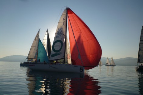 Wir ziehen für den finalen Schlag von Schörfling bis Attersee wieder den Spi, aber er steht nur sehr mäßig. Erst nach nochmaliger Halse können wir auf einem Vorwindkurs bis vor den Verein runtersegeln. Um 5.30 Ur queren wir die Ziellinie, gewertet werden wir aber – wie alle – schlag Fünf, da stehen wir noch 2,5 km vor dem Verein.