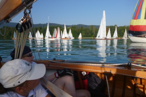 64 der gemeldeten 75 Yachten und Boote sammeln sich so kurz vor 7 Uhr auf der Startlinie. Alle richten sich Richtung Süden aus und dann geht es los – das große gemeinsame Treiben – gemeinsam treiben wir mit 0,6 – 0,8 Knoten Richtung Süden. Von knapp vor der Seemitte bis unter Land verteilen sich die Boote und wir mitten drin. Die erste Stunde geht es eigentlich hauptsächlich darum nicht zwischen die großen Yachten zu kommen und auch nicht in deren Windschatten zu verhungern.
