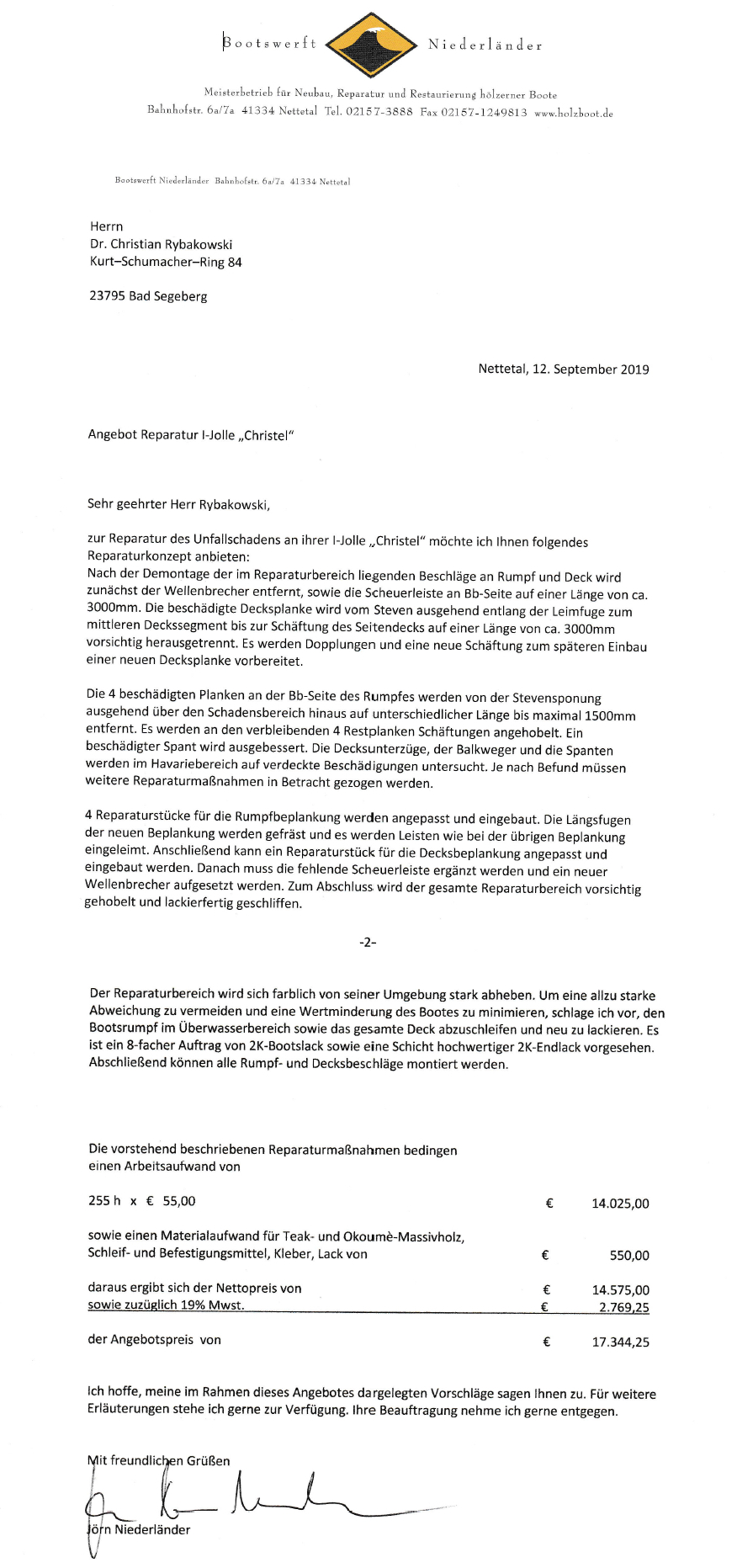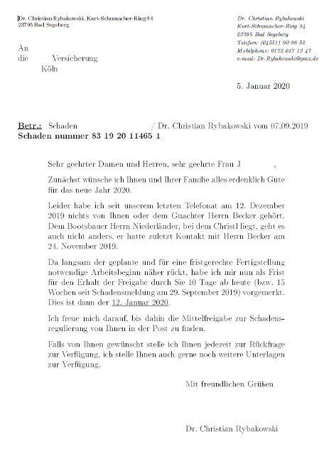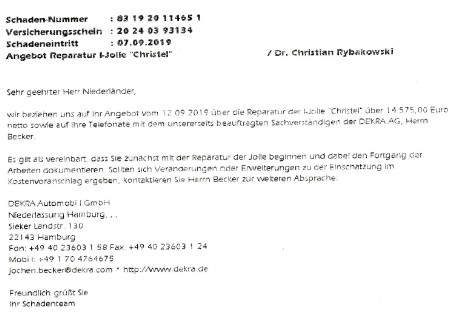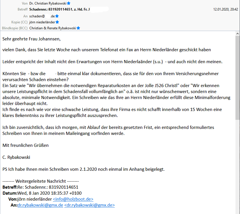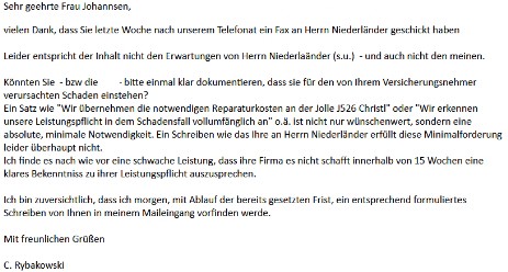 Aber nun geht die Auseinandersetzung mit der Versicherung in die 2. Runde: Nach dem Versenden der Rechnung der Bootswerft mit der Bitte um Kostenerstattung erfolgt erstmal wieder die Standardreaktion: 2 Wochen nix.