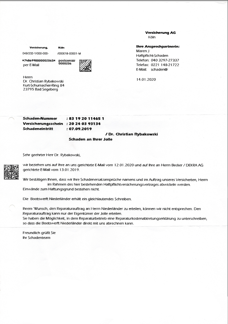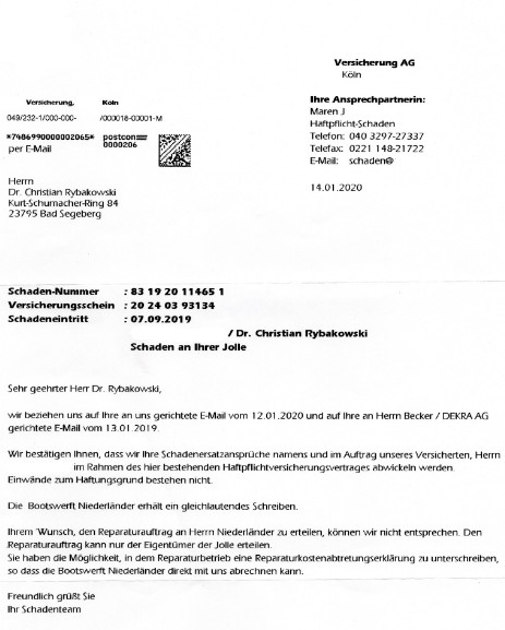 Siehe da, mit Datum des 14.1.2020 (Woche 16 nach der Schadensmeldung): "Wir bestätigen Ihnen, dass wir Ihre Schadensersatzansprüche namens und im Auftrag unseres Versicherten, (...) , im Rahmen des hier bestehenden Haftpflichtversicherungsauftrages abwickeln werden. Einwände zum Haftungsgrund bestehen nicht."