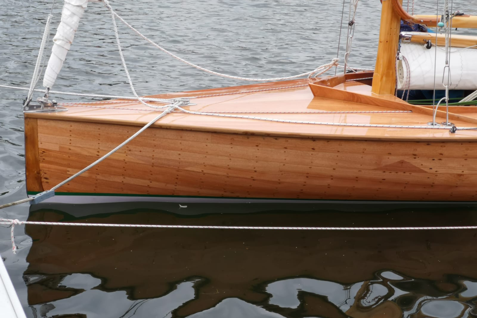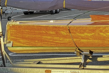 Um die Farbabweichungen zu minimieren wurde der übrige Bootskörper abgedeckt und nur der fertig geschliffene Reparaturbereich dem Sonnenlcht ausgesetzt, damit das neue Holz - zumindest ein Stück weit - nachdunkeln konnte. Dann wurde der restliche Überwasserbereich des Rumpfes und das Deck abgeschliffen (wobei sorgfältig vermieden werden musste, den gerade nachdunkelnden Reparaturbereich zu verschmutzen - jedes Entfernen von Dreck hätte die Patina sofort wieder zerstört !) .