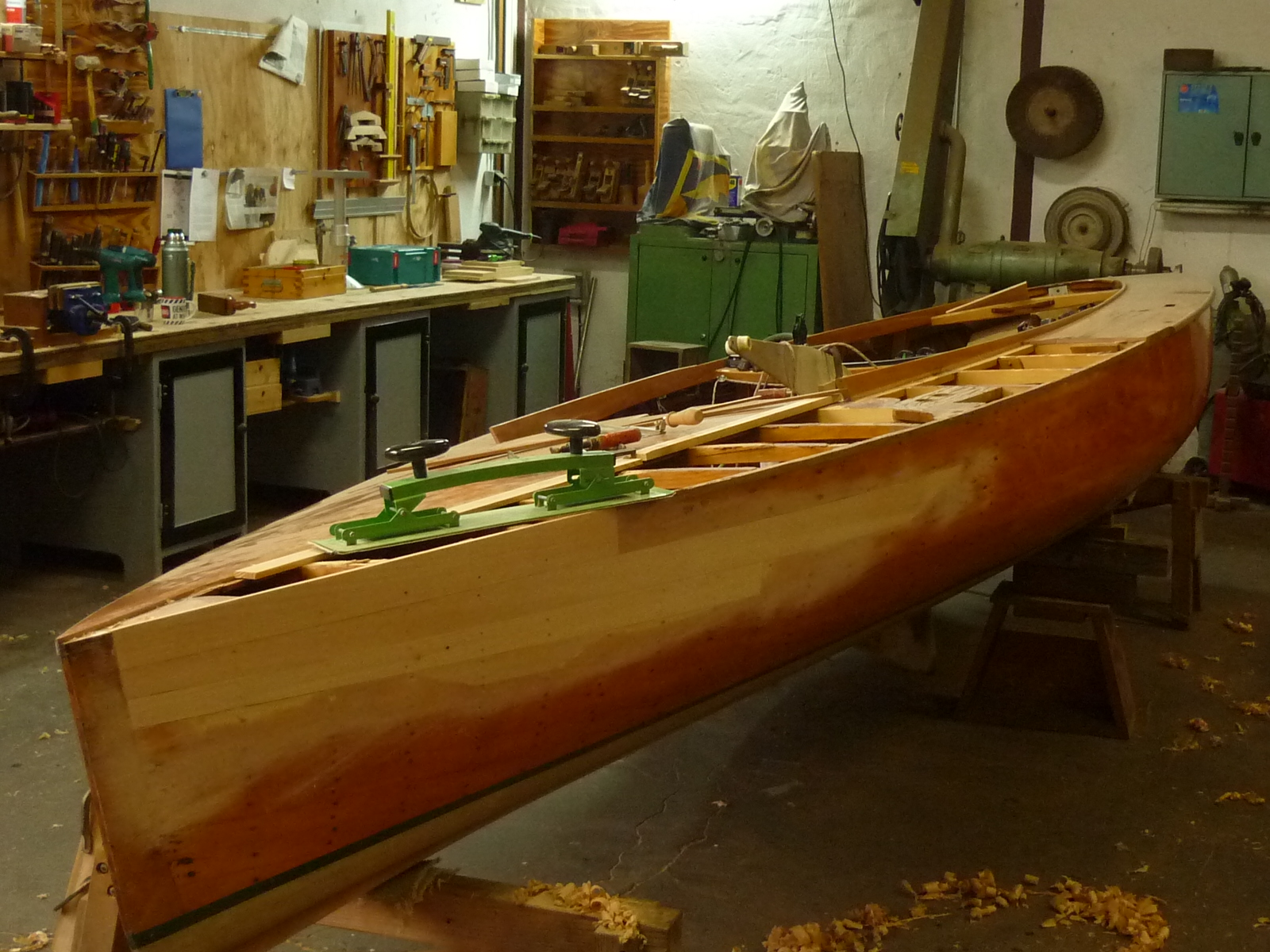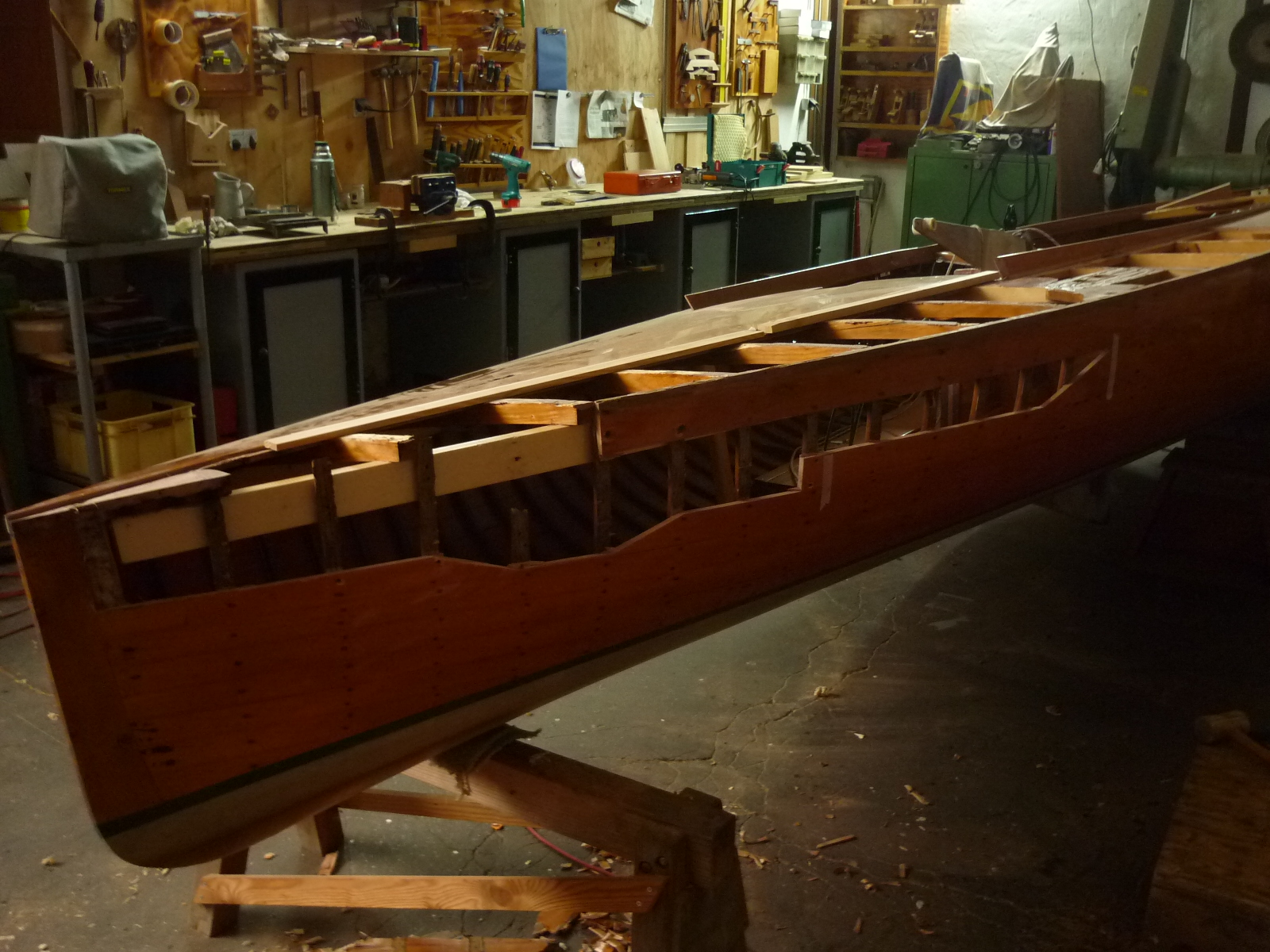 Dann konnten neue Planken eingesetzt, mit den Spanten vernietet und die Leisten ausgefräst und eingeklebt werden.