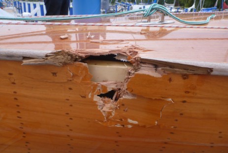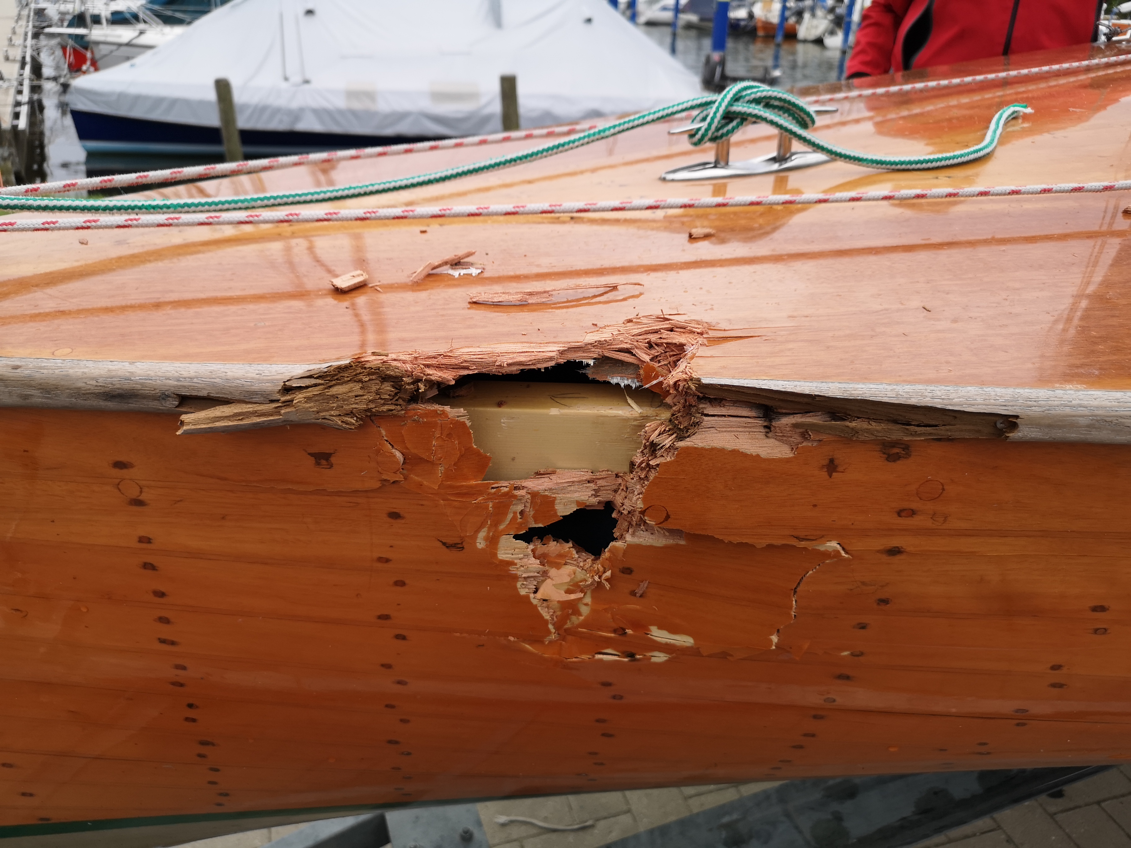 Unser Unfallgegner hat auch abgebrochen, bei ihm hat sich durch den Aufprall die Laminierung über dem Holz im Bugbereich gelöst – irgendwo muss die Energie halt hin.
