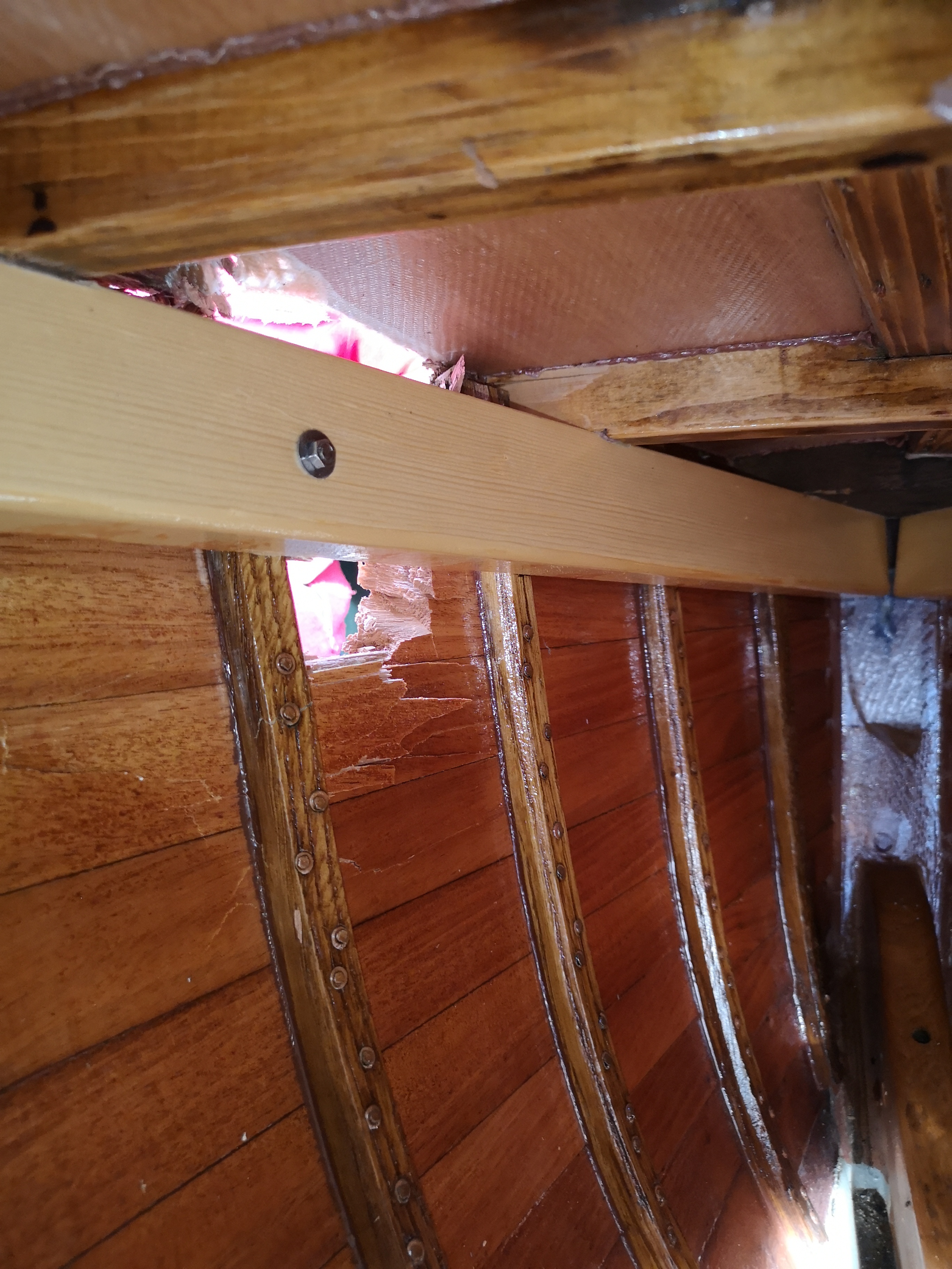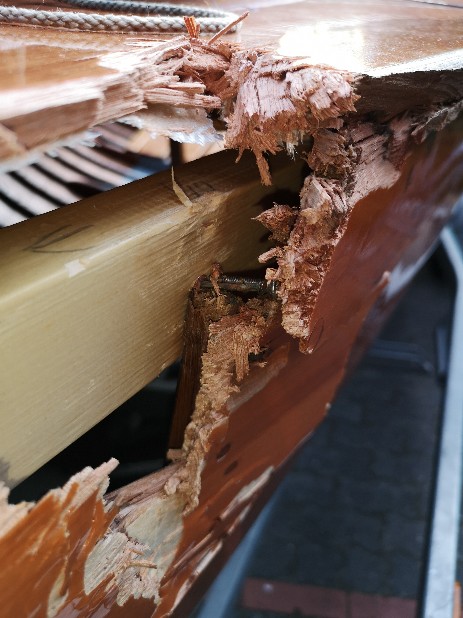 Der beschädigte Spant wurde geschäftet und ausgebessert, es fanden sich zum Glück keine verdeckten Beschädigungen in Bereich der Decksunterzüge, des Balkwegers und der übrigen Spanten.