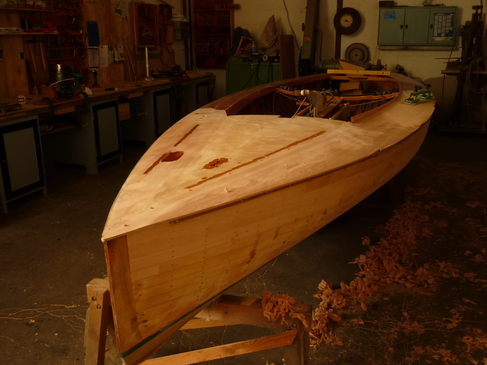 Nun wird zunächst das eingedrückte Vordeck und die Scheuerleiste nach Demontage der Beschläge und des Wellenbrechers auf ca. 3 m entfernt, hierbei wird die beschädigte Decksplanke vom Steven her entlang der Leimfuge bis zur Schäftung des Seitendecks im mittleren Deckssegment herausgetrennt. Die notwendigen Dopplungen und eine neue Schäftung zum Einbau der neuen Decksp[anke wurden vorbereitet.