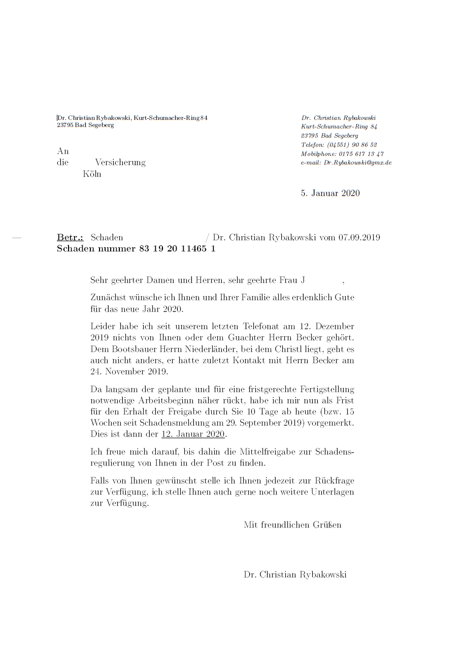 Im Januar dann moderate Verschärfung des Tonfalls im Schreiben an die Versicherung mit erster Fristsetzung für einen Termin zur Mittelfreigabe: