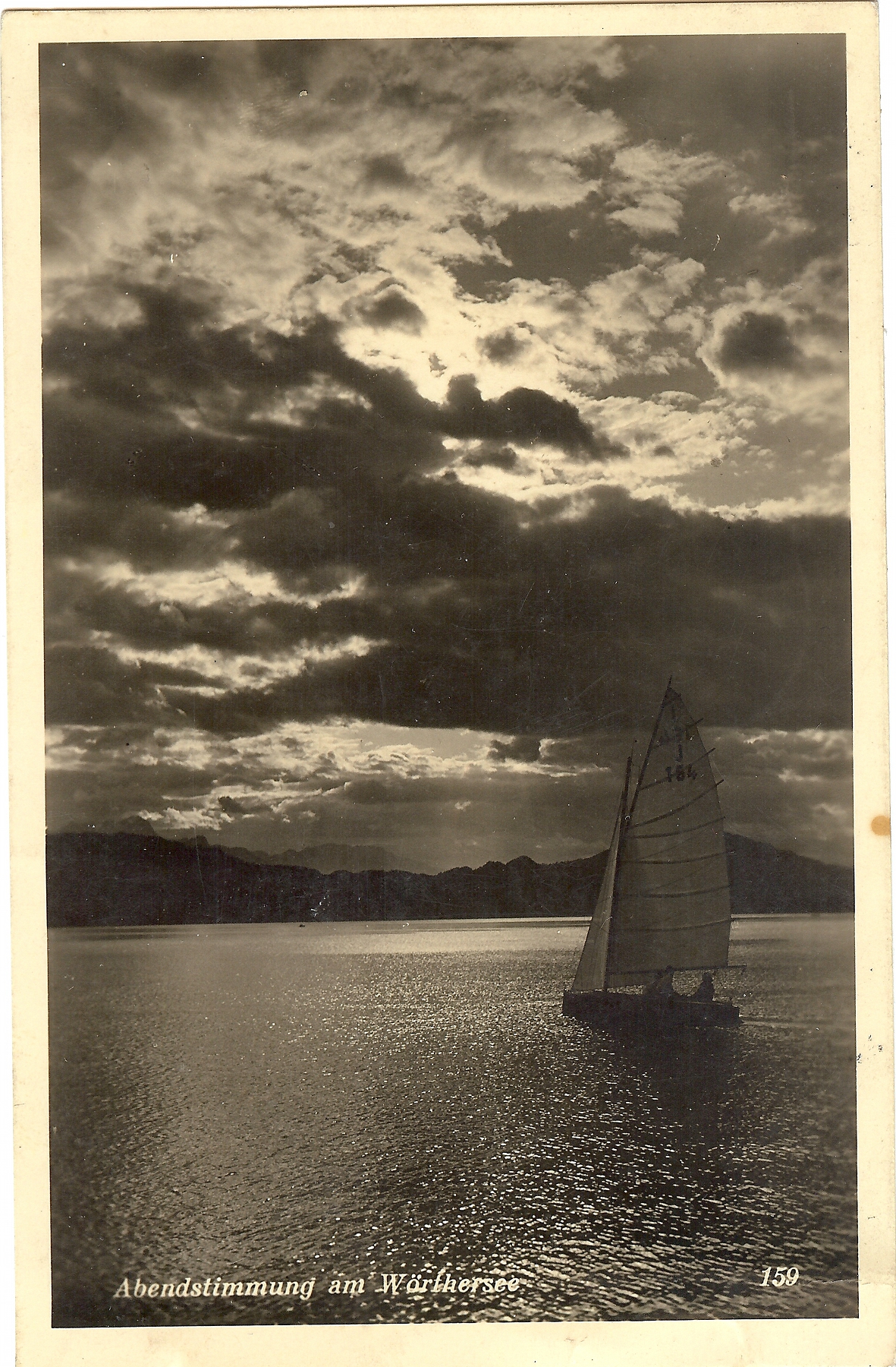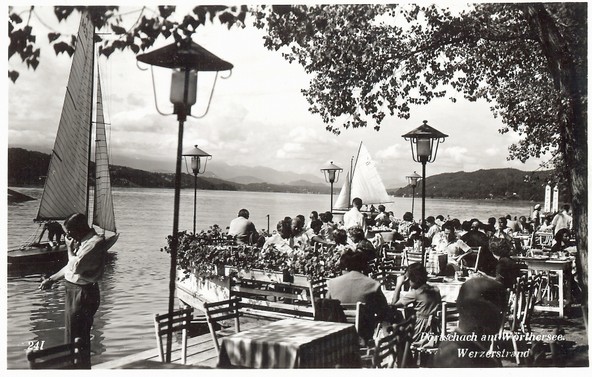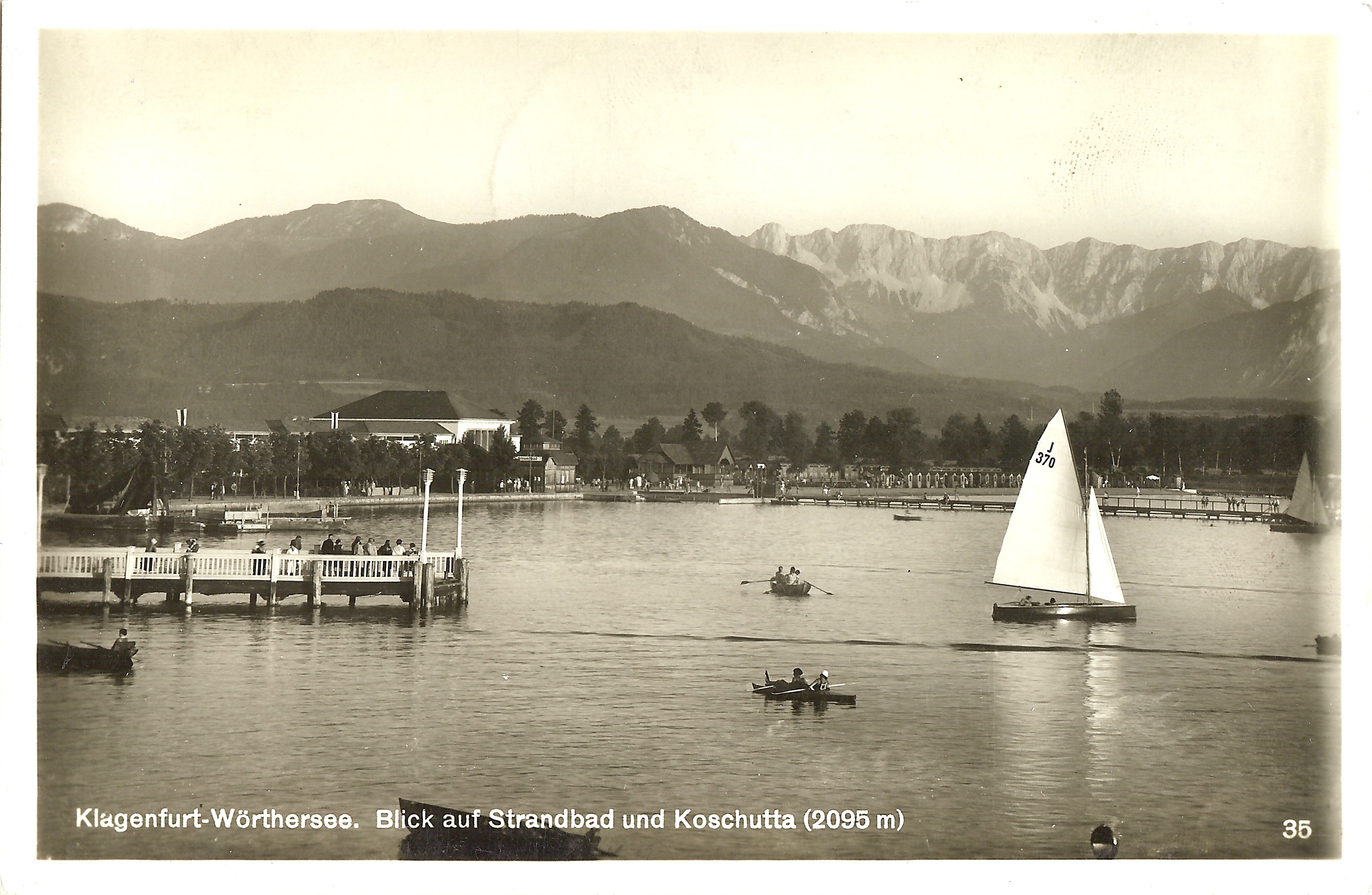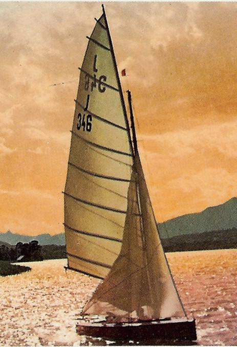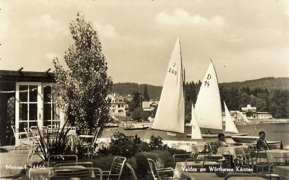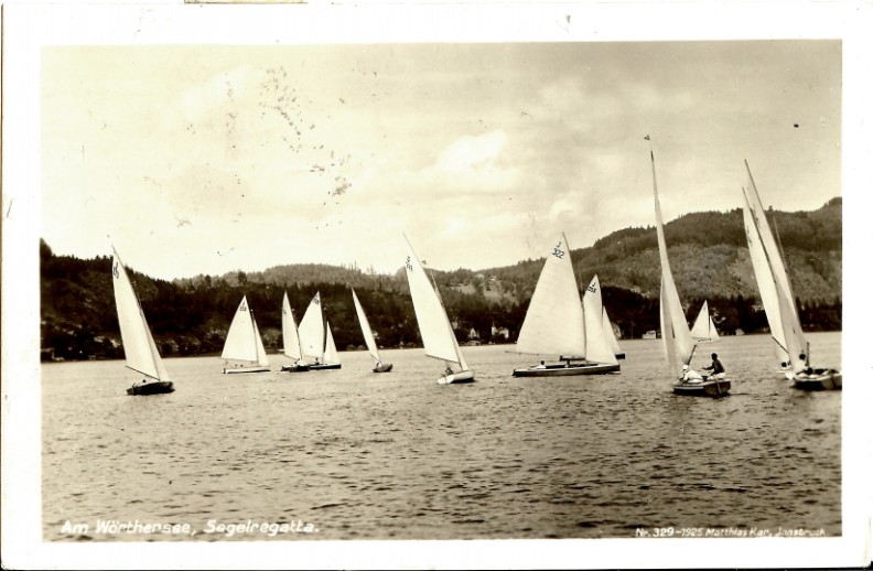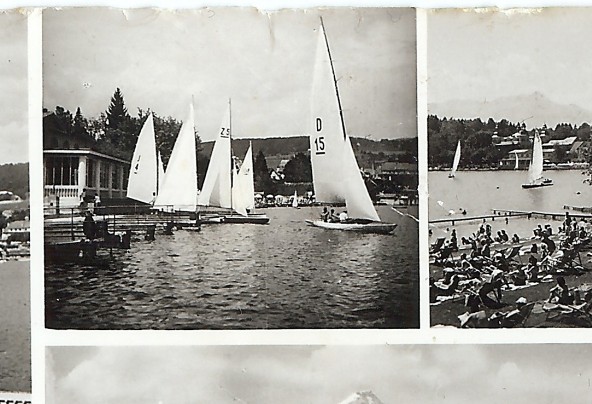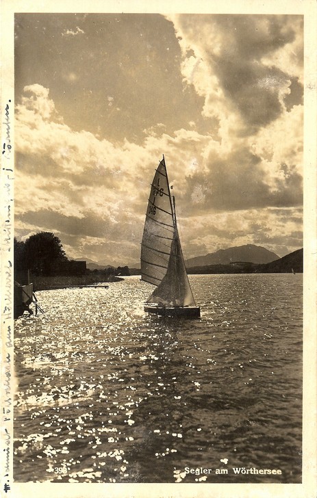 Links: J 346 "Orplid II" auf dem Wörthersee, aufgenommen im Jahr 1938 im Gegenlicht auf dem Wörthersee. Die Jolle wurde 1925 eingetragen und gehörte zum Union YC Wörthersee